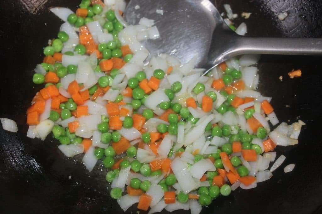 Verter la tortilla frita en una fuente y añadir aceite al wok (o sartén). Poner al menos 4 cucharadas de aceite. Añadir los guisantes, la zanahoria y la cebolla, y los dientes de ajo picados.