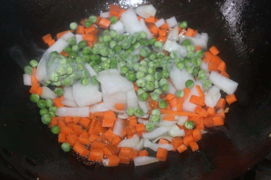 - Versez l’omelette frite dans un plat puis rajoutez de l’huile dans le wok (ou poêle). Mettez au moins bien 4 cuillerées à soupe d’huile. Ajoutez les petits pois, la carotte et l’oignon, ainsi que les gousses d’ail hachées.