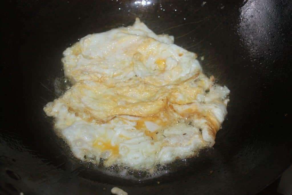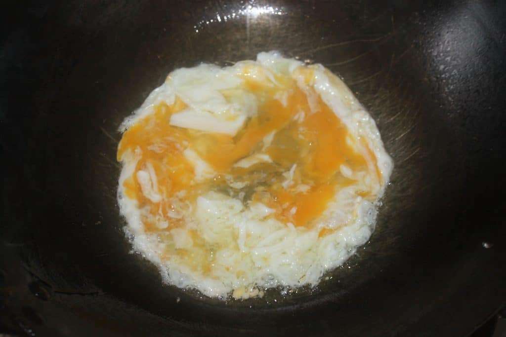 - Versez 2-3 cuillerées à soupe d’huile dans un wok ou une large poêle. Cassez-y les œufs sur feu assez soutenu.