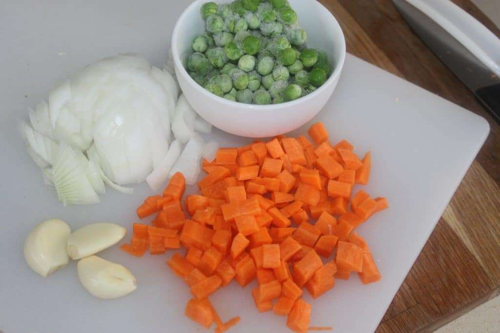 - Préparez tous les ingrédients : épluchez l’ail, la carotte et le demi oignon. Coupez en petits morceaux.