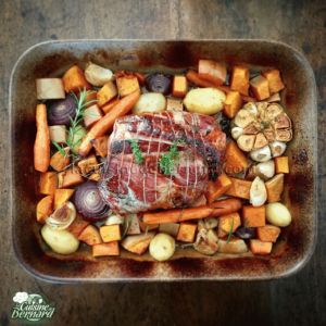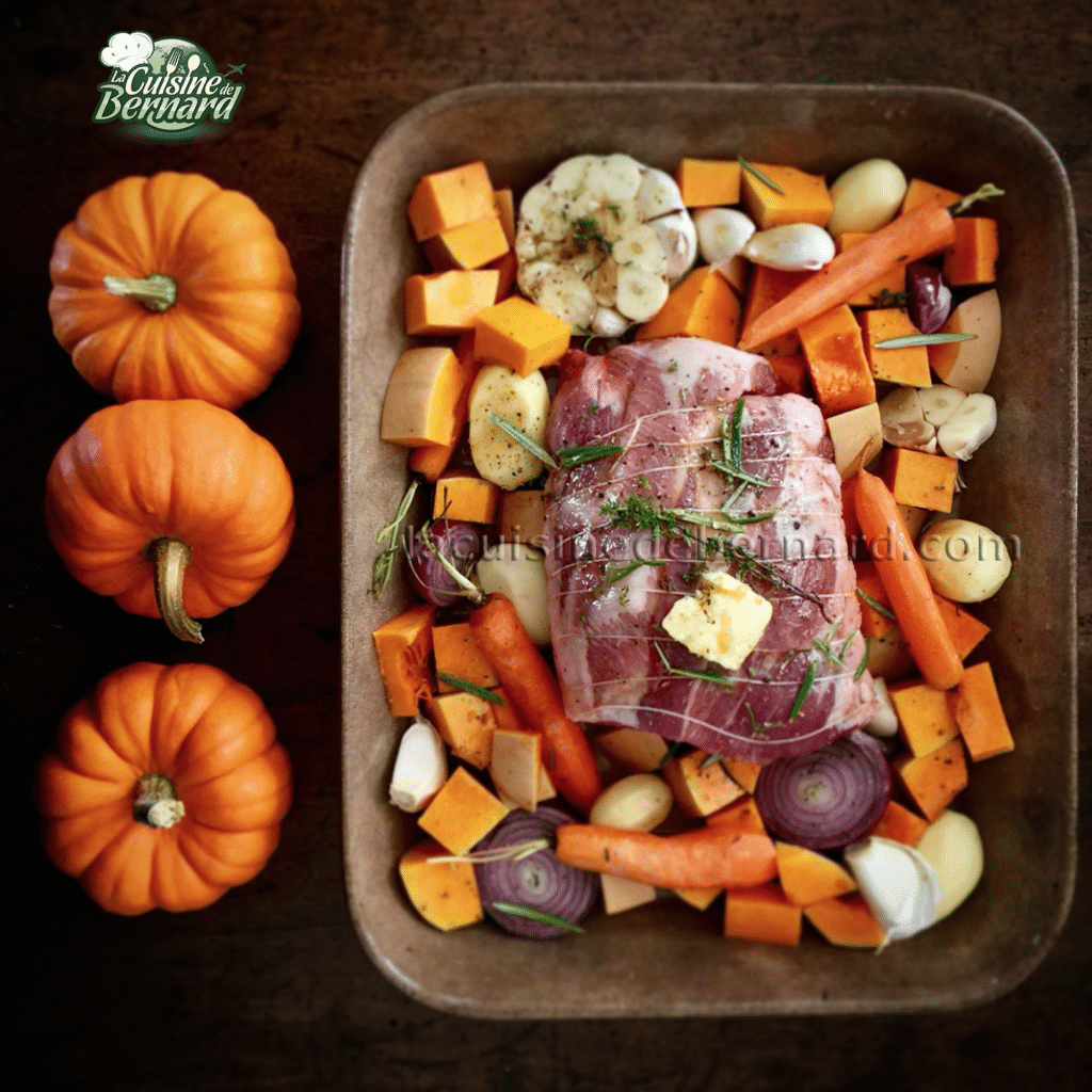 Je viens de faire ce plat pour le dimanche midi, sans prévoir de le mettre sur le blog. C’était un repas simple, avec des légumes du marché, mais tellement bon que je me suis dit que j’allais finalement mettre la recette. Le plat est prêt à passer au four en 10 minutes et une heure après, il n’y a plus qu’à servir ! Les effluves envahissent la maison et c’est totalement alléchant. La viande est caramélisée, les légumes sont cuits parfaitement. Bref, je referai ! Pour l’automne, j’ai mis de la courge butternut et un peu de « Jack Be Little », un mini-potiron ultra charmant. Mais vous pouvez évidemment y mettre ce que vous voulez, car c’est ce que j’ai fait en mettant des carottes et des pommes de terre qui trainaient dans la remise…