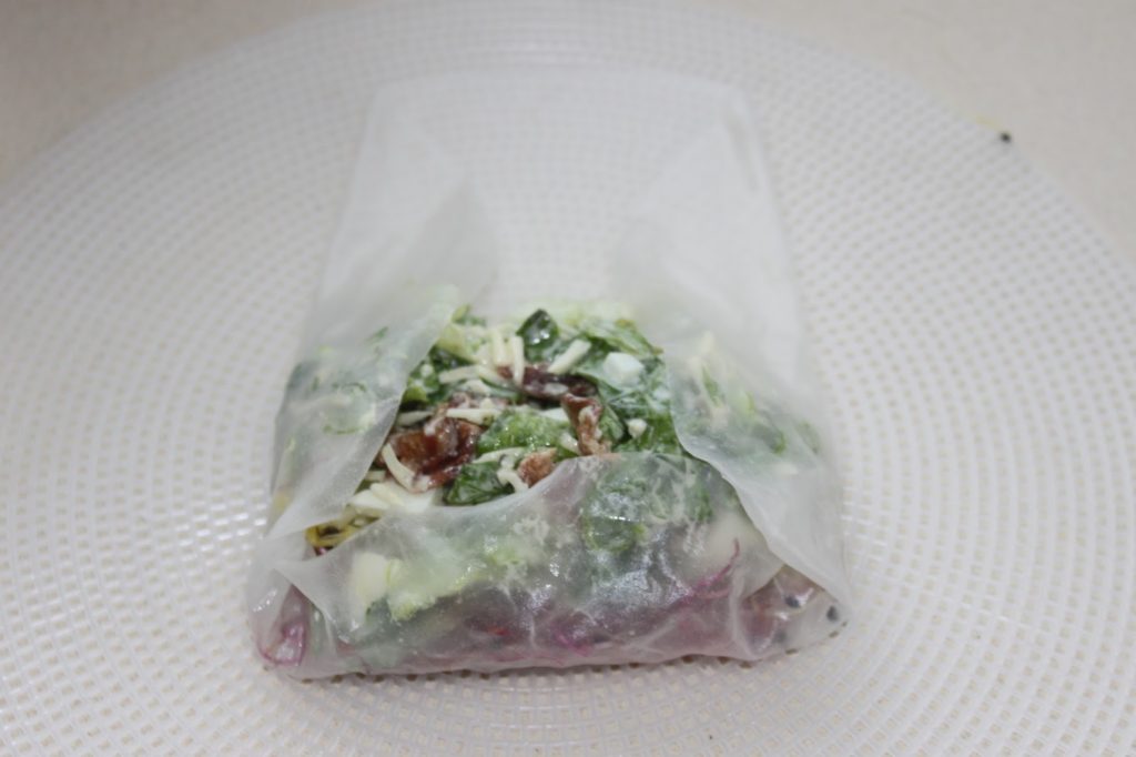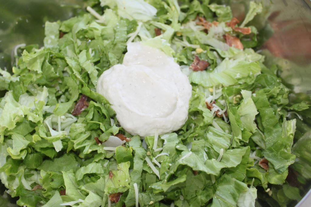 - Mélangez bien et versez les 80 à 90g de sauce. Vous pourrez en mettre davantage si vous mettez plsu de salade. À vous d’ajuster.