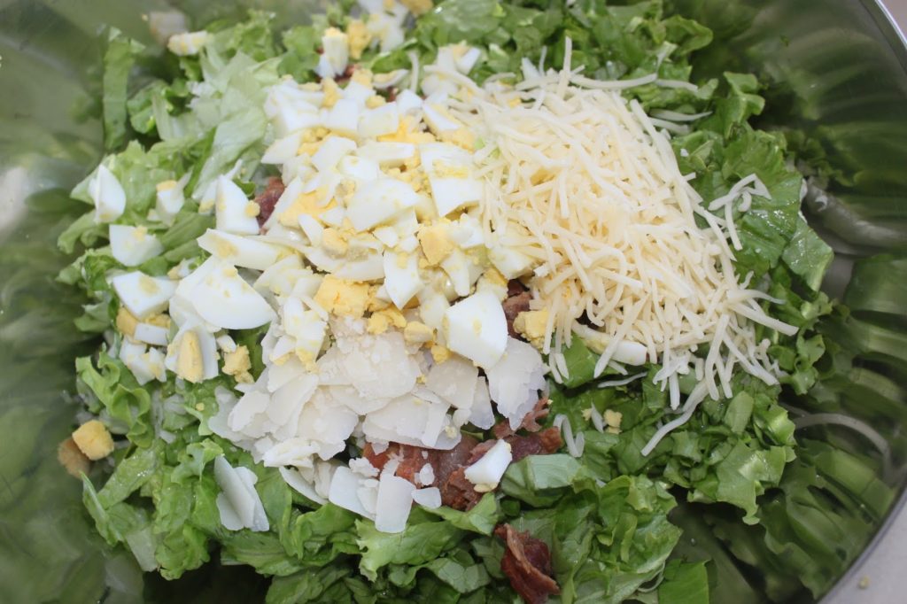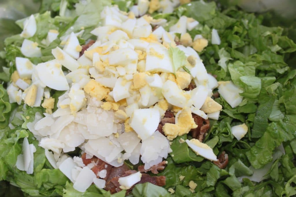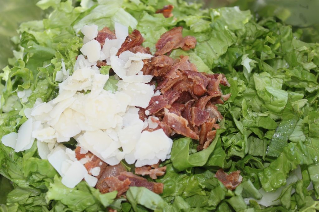 - Versez les feuilles coupées de salade (300 à 350g) dans un grand saladier. Ajoutez le parmesan en copeaux et le bacon en morceaux.