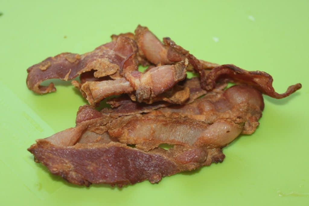 - J’ai acheté du bacon déjà cuit et croustillant. C’est délicieux mais vous pouvez ne pas en mettre, ou le remplacer par des croûtons ou même un peu de blanc de poulet cuit et refroidi.