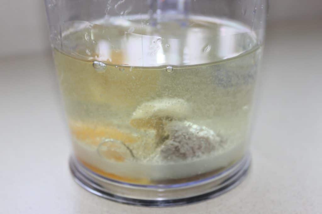 - Avec un mixeur plongeant, commencez à émulsionner au fond, pour broyer les gousses d’ail et la crème d’anchois puis remontez doucement pour que la sauce prenne bien.