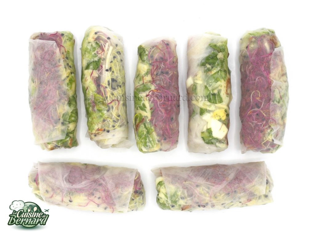 - Pour les rouleaux, préparez-les le plus tard possible car la sauce va « cuire » la salade. Il faut donc tout mélanger au dernier moment et les rouleaux se font vraiment en 5 minutes. Lavez quelques feuilles de salade, sachant que 300g à 350g suffiront.