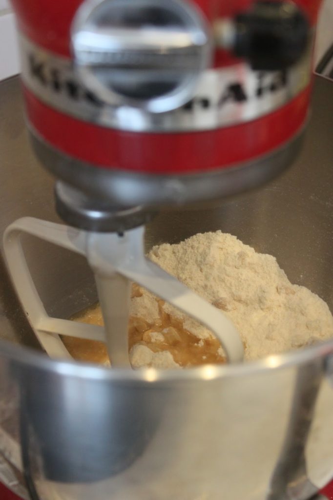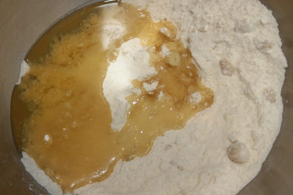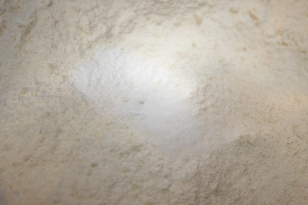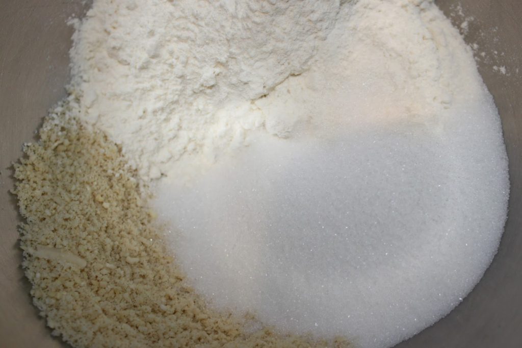 - Versez cette poudre dans un récipient ou dans la cuve de votre robot. Ajoutez la farine et le sucre.