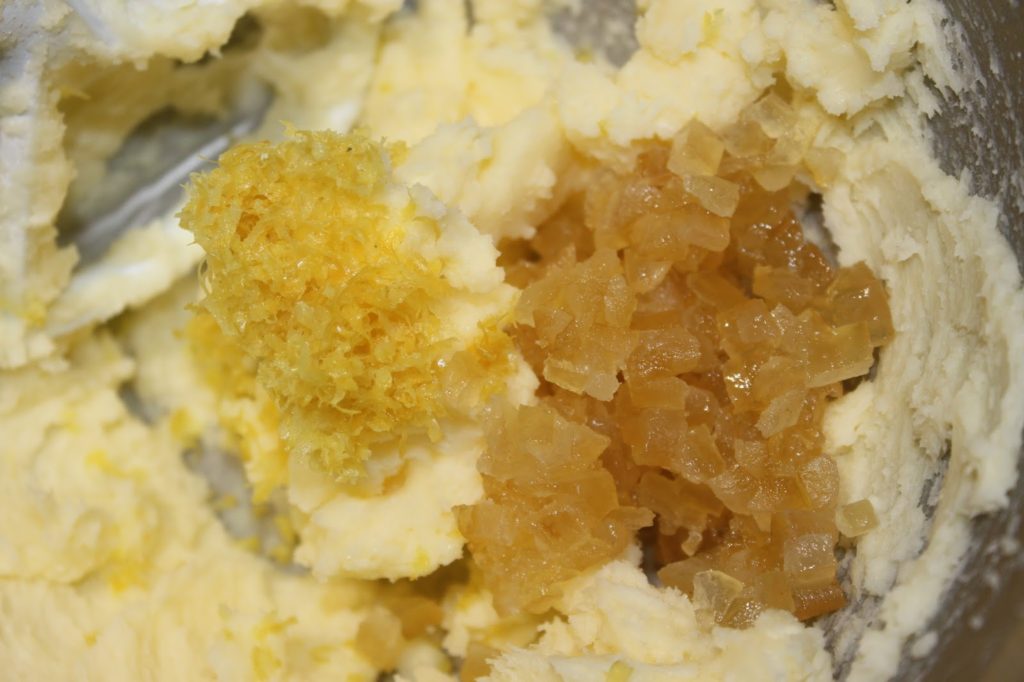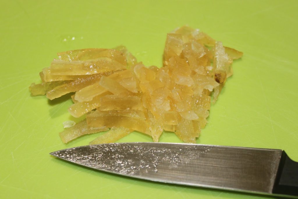 - Coupez les zestes de citrons confits (sucrés !) en petits morceaux. Pour une fois, j’ai pris la marque vahiné au supermarché et cela convient tout à fait.
