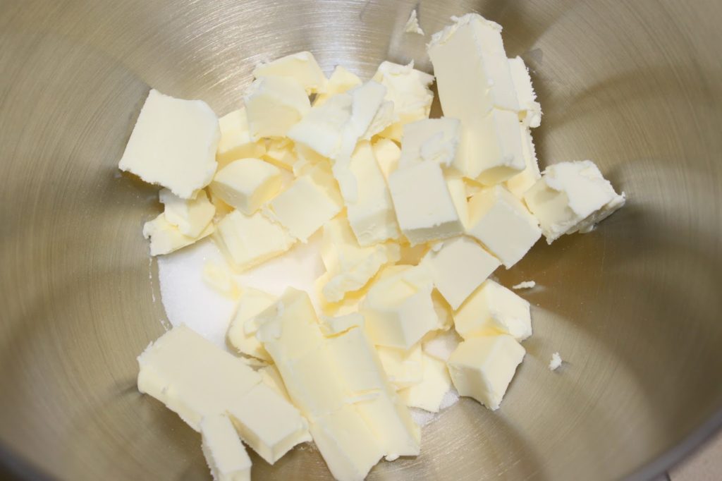 - Versez le sucre et le beurre coupé en morceaux dans la cuve de votre robot ou dans un récipient.