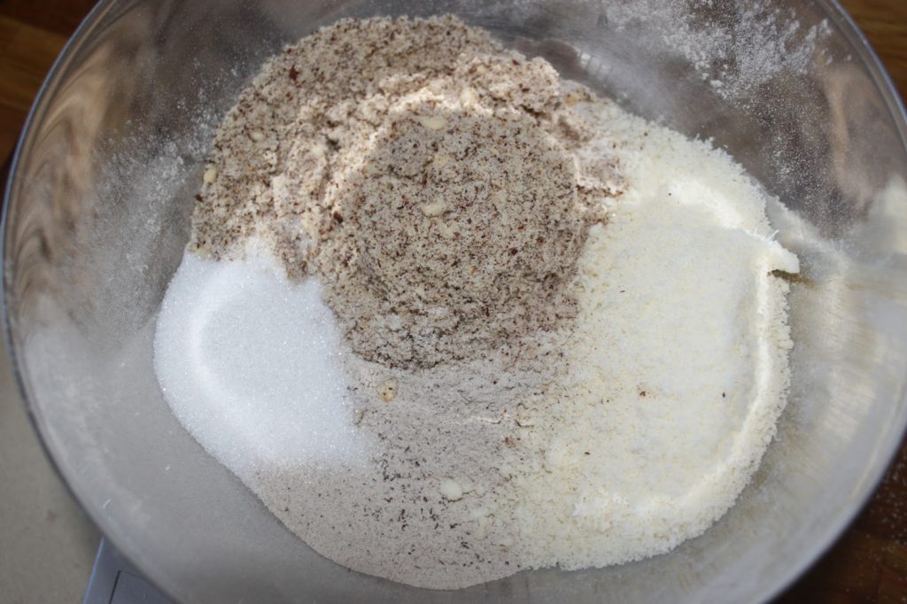 Versez dans un récipient, la farine complète de sarrasin, le parmesan, les noisettes en poudre, le sucre, le sel et du poivre du moulin. Pour les noisettes, je les ai hachées au mixeur. Si la poudre n’est pas parfaite, rien de grave et tant mieux en fait, car il y aura des petits morceaux de noisettes apparents !