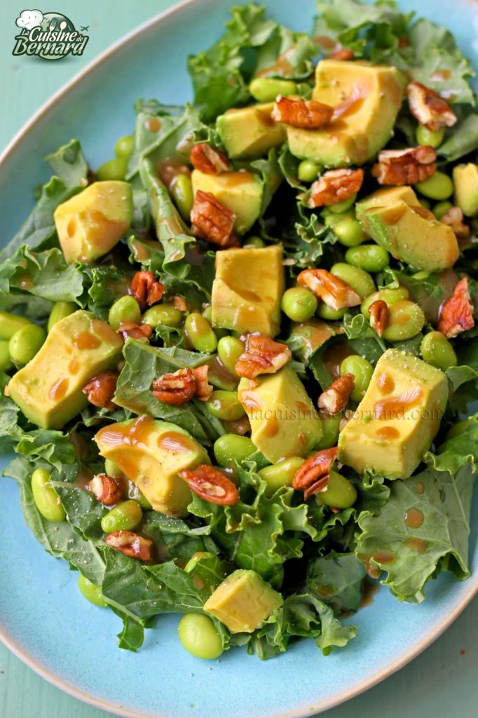 Envie d’une belle salade et de vert dans votre assiette? Je vous propose ma salade de chou kale aux edamame, avocats et noix de pécan. J’en avais mangé une similaire à New-York et il me tardait de la refaire. Je prépare ici une sauce délicieuse à base d’huile d’olive, de vinaigre balsamique, de tahiné et d’une touche sucrée à base de sirop d’agave. Du coup elle convient aux végans. Mais surtout c’est une salade qui fera un vrai repas. On parle beaucoup du chou kale, et j’espère que cela ne sera pas qu’une mode, car je la trouve très consistante et roborative. Je vous avais fait des chips de chou kale ultra croustillantes dans mon livre Végéterrien et que je vous proposais aussi en vidéo dans un facebook live du 11 octobre 2017 que vous pouvez retrouver ICI.