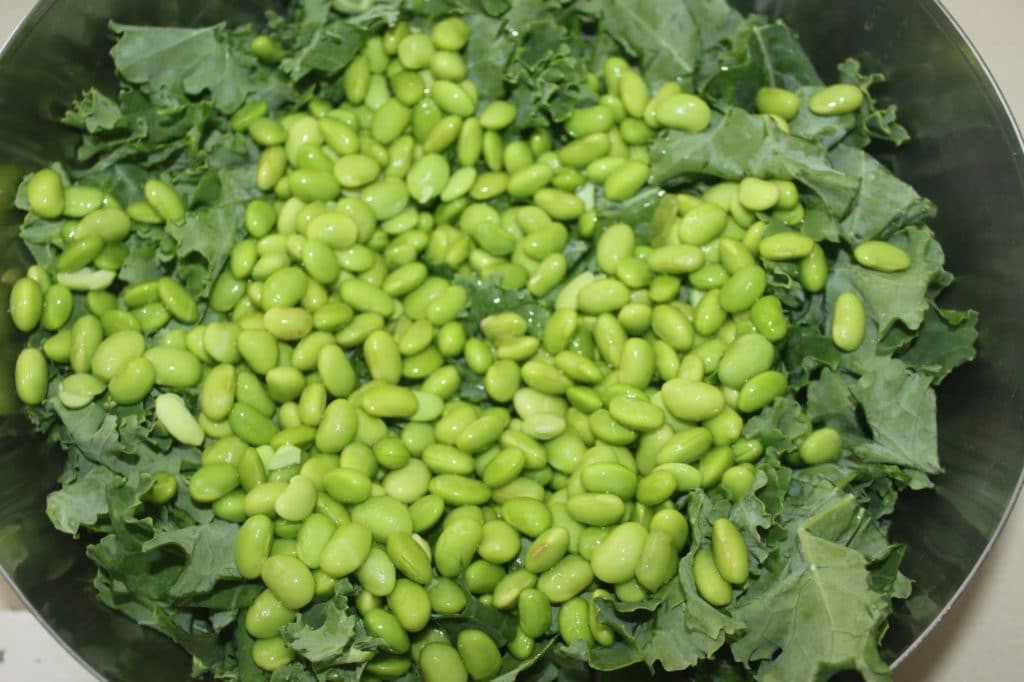Poner la col y el edamame en un recipiente grande.