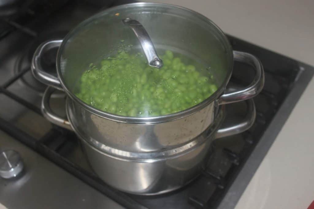 - Faites tout d’abord cuire les edamame à la vapeur pendant 8-9 minutes. Je les trouve déjà écossés dans les supermarchés asiatiques. Vous pouvez prendre des fèves ou des petits pois que vous ferez cuire de la même façon.