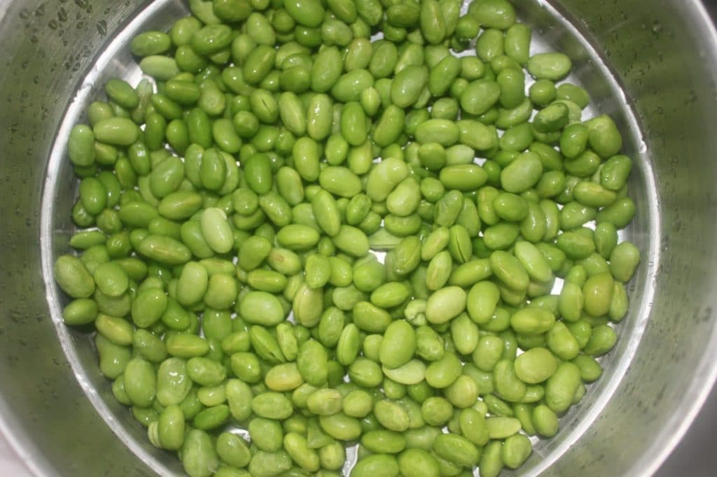 Primero se cuece al vapor el edamame durante 8-9 minutos. Ya los puedo encontrar sin cáscara en los supermercados asiáticos. Puedes utilizar judías o guisantes y cocinarlos de la misma manera.