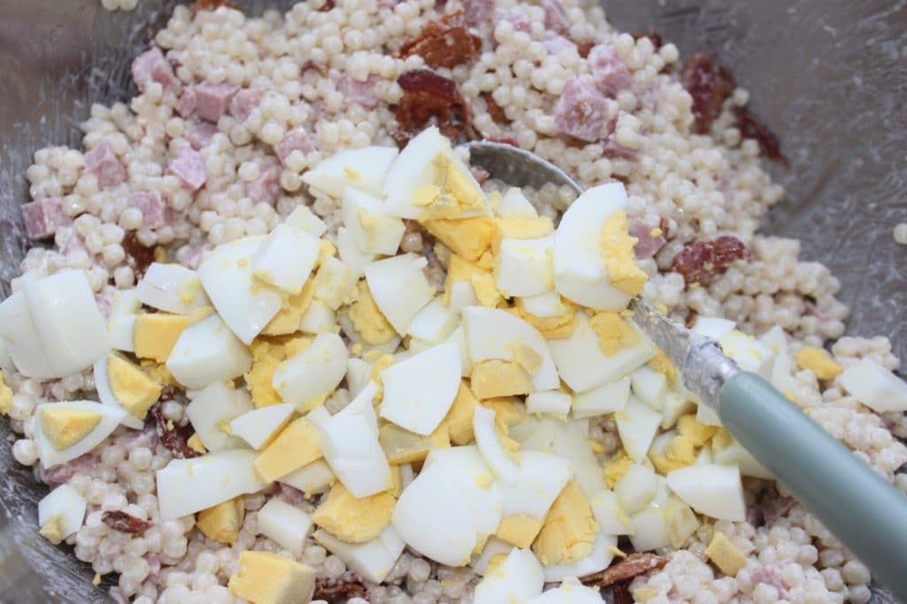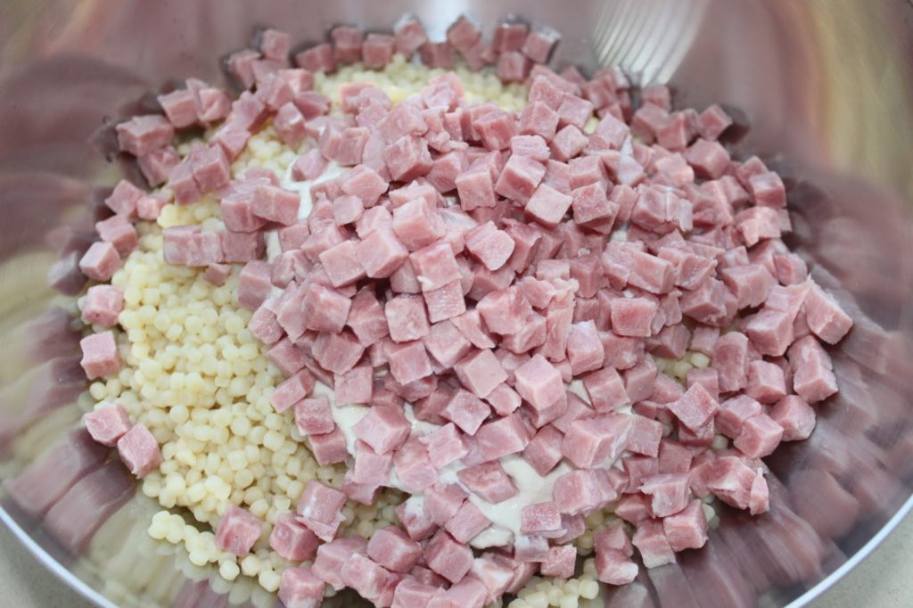 - Coupez le jambon en cubes et versez-le dans le récipient.