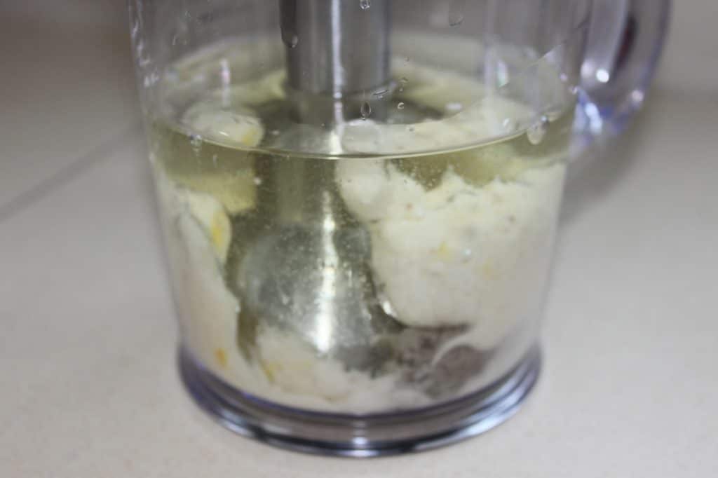 - Avec un mixeur plongeant, commencez à émulsionner au fond, pour broyer les gousses d’ail et la crème d’anchois puis remontez doucement pour que la sauce prenne bien.