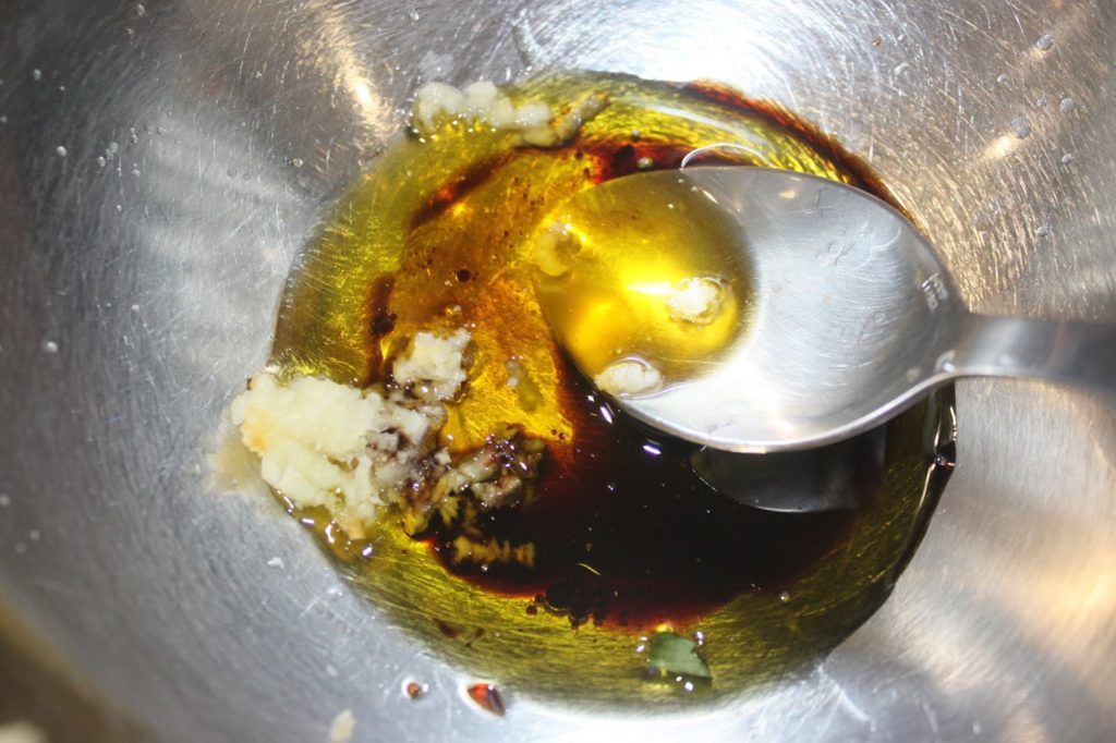 - Dans un petit récipient, mettez le miel, le vinaigre balsamique, la gousse d’ail épluchée et hachée (j’ai mon presse-ail pour ça !), l’huile d’olive et l’huile de sésame grillé.Dans un petit récipient, mettez le miel, le vinaigre balsamique, la gousse d’ail épluchée et hachée (j’ai mon presse-ail pour ça !), l’huile d’olive et l’huile de sésame grillé.