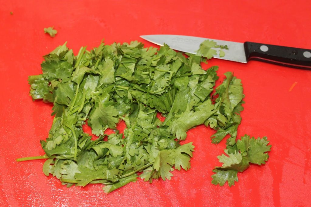 - Hachez finement la coriandre et versez tout dans le récipient.