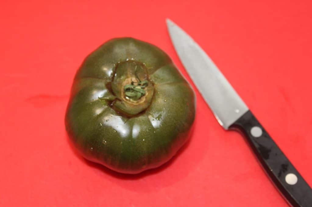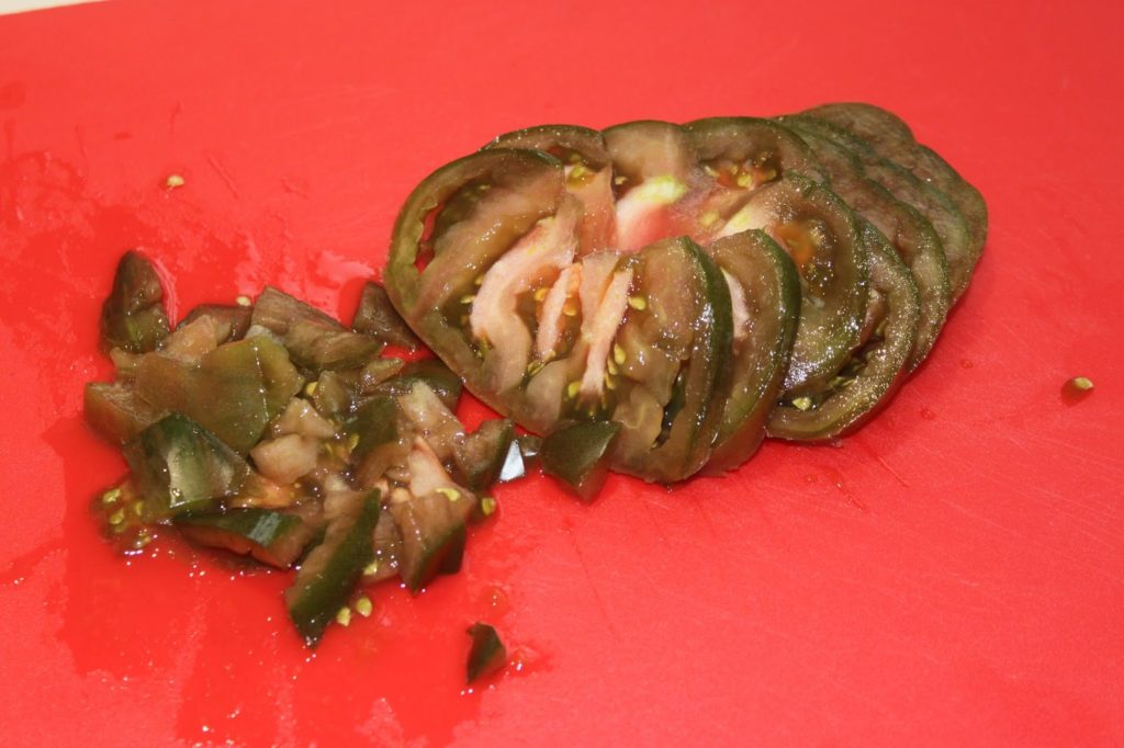 - Coupez en morceaux la tomate. Ici j’ai pris une grosse tomate verte et bien mûre.