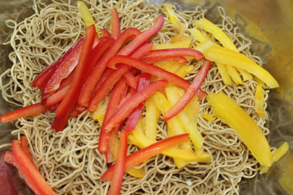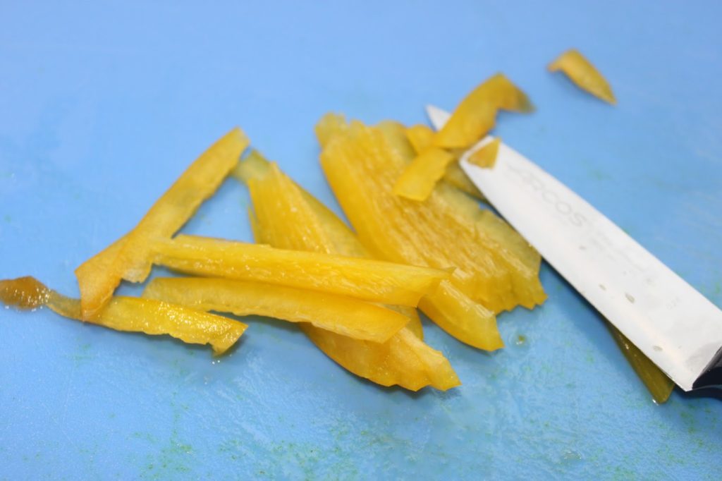 - Vous n’aurez besoin que d’un demi-poivron jaune et d’un demi-poivron rouge. Vous pouvez ne mettre que l’un ou l’autre. Épépinez-les et coupez-les en très fines tranches.
