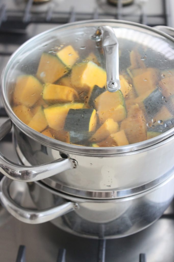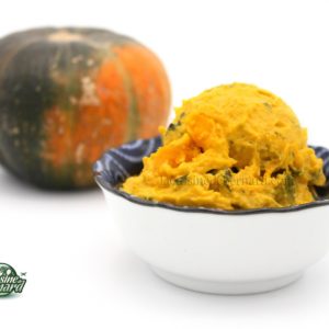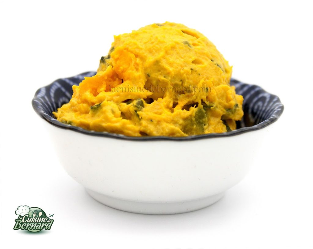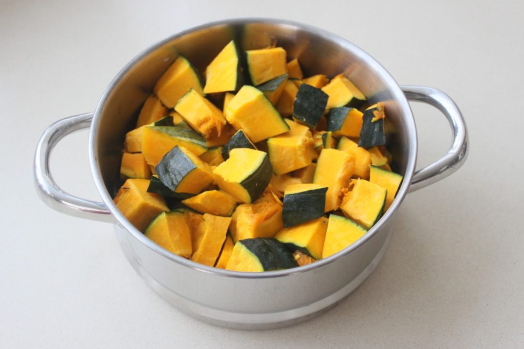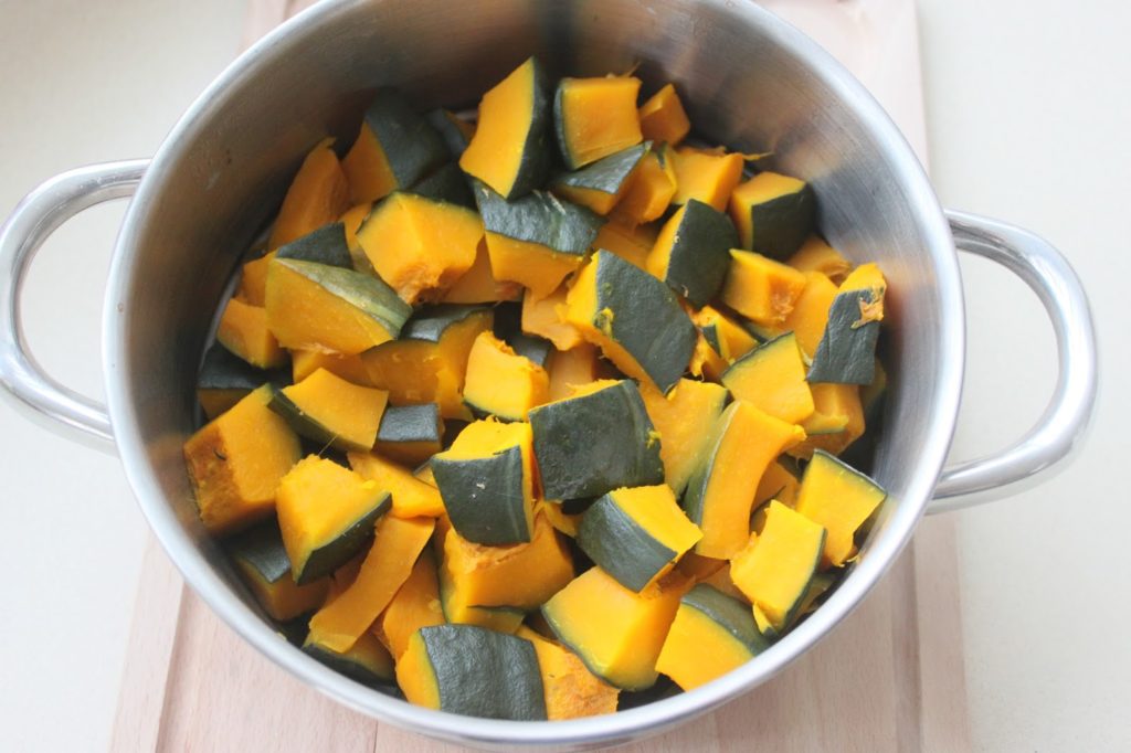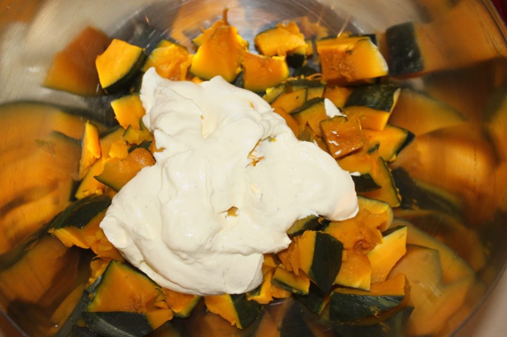 - Versez la sauce dans la kabocha refroidie. Vous n’êtes pas obligé de verser la totalité. Allez-y progressivement et à votre goût ! J’ai mis presque toute la sauce pour 1,2kg de chair de kabocha.