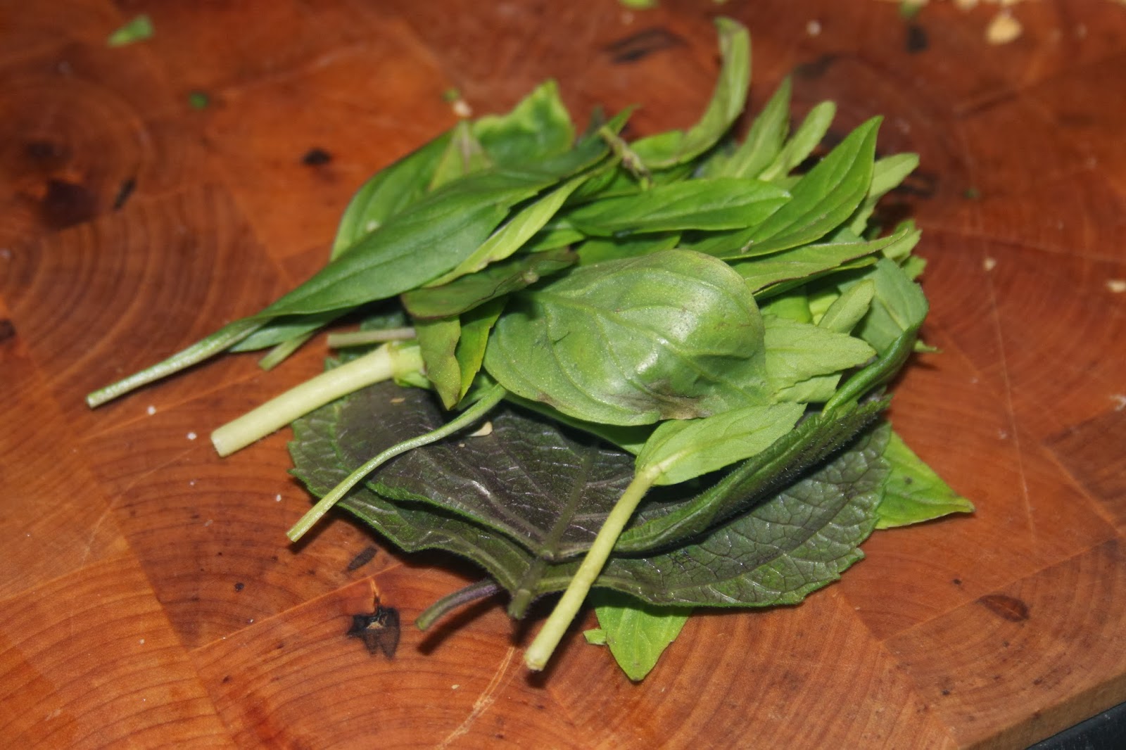 - Par portion (par personne donc) mettez 2-3 feuilles de basilic thaï, la même chose de feuilles de shiso, de feuiles de ma-om. Cette dernière est sans plus doute difficile à trouver (quoique si vous avez un endroit où vous trouvez des feuilles de shiso et de basilic thaï, vous devriez trouver le ma-om) mais vous pouvez la remplacer par de la menthe (en en mettant 2 fois moins).
