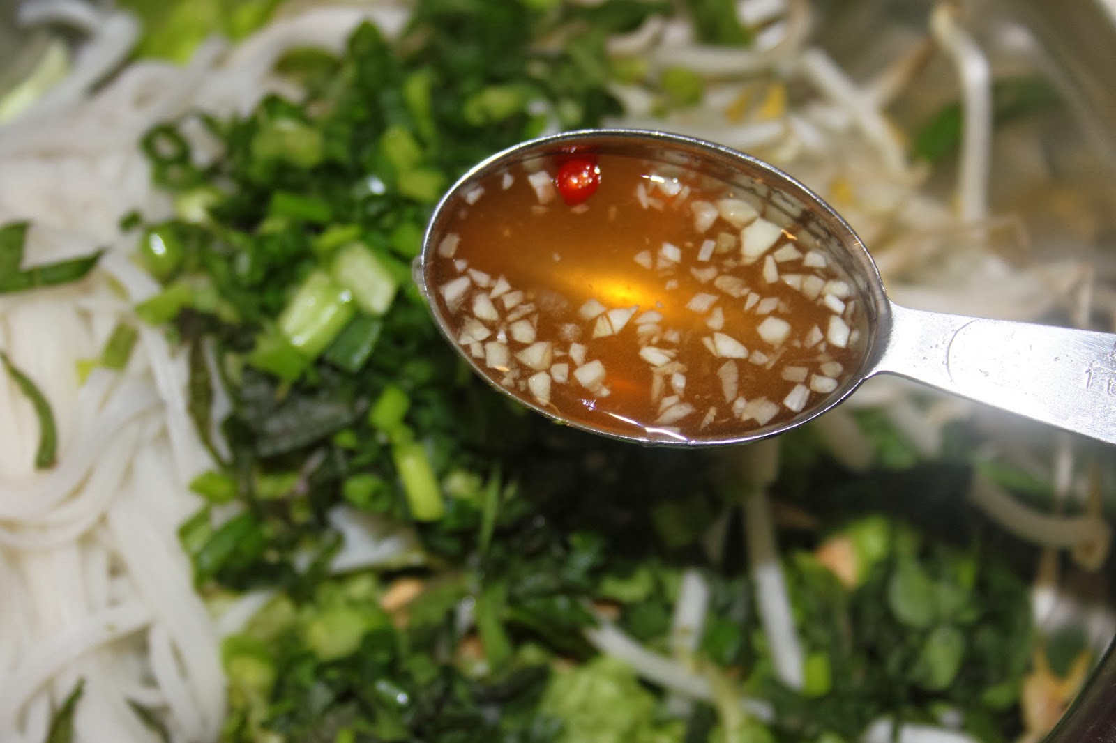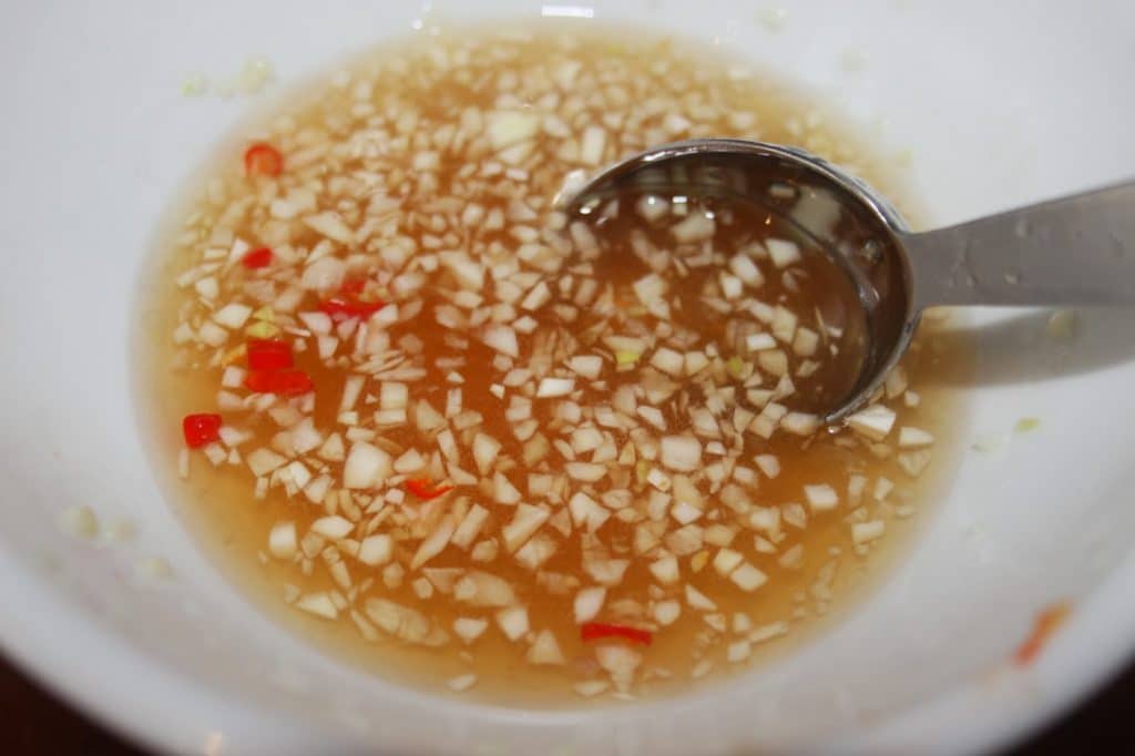 Pour la sauce salade: mélangez le sucre et le nuoc mâm jusqu’à ce que le sucre soir dissous.