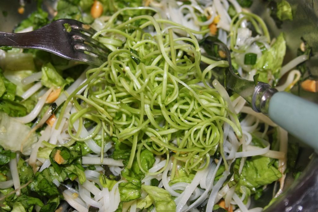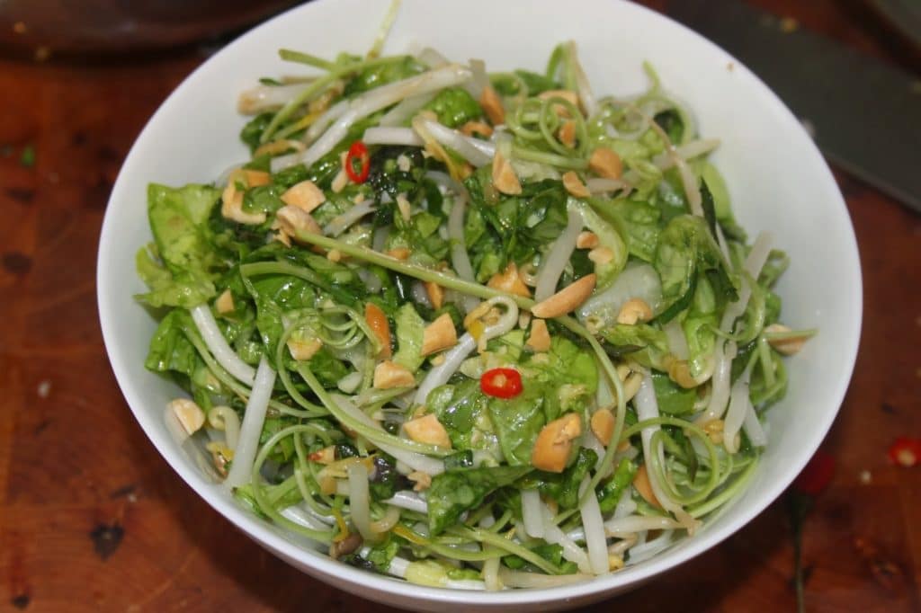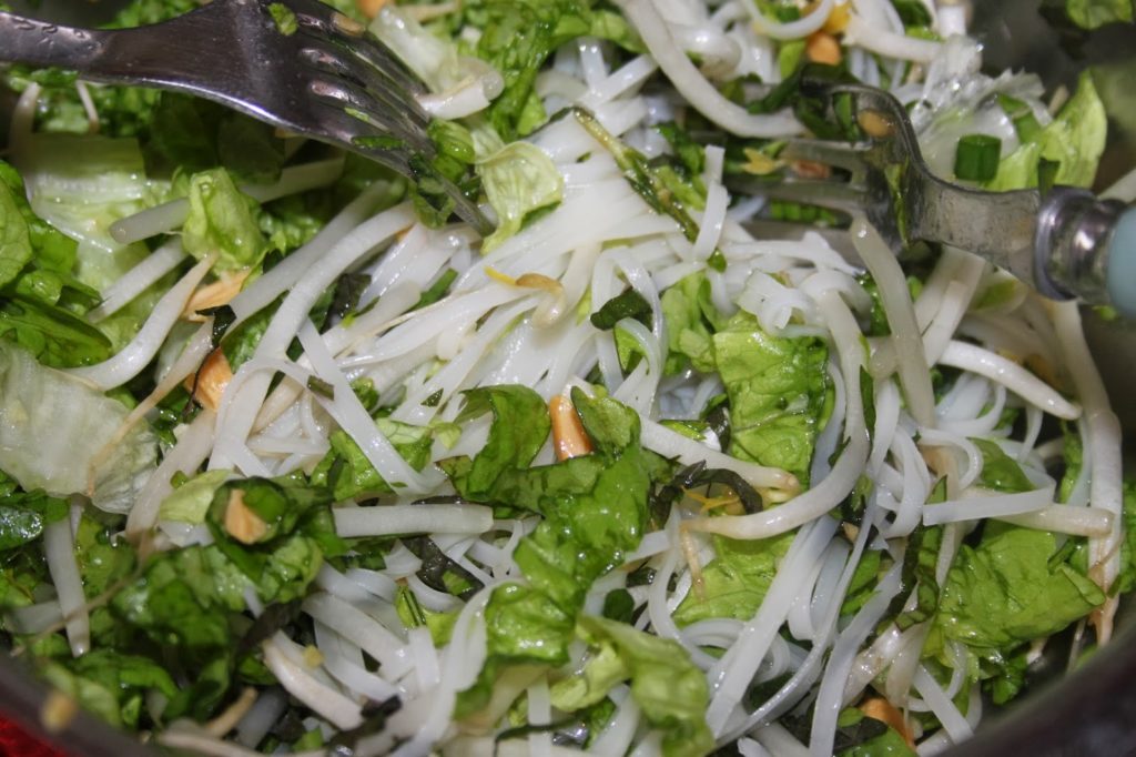 - Pour chaque personne, mettez la salade, une poignée de nouilles refroidies et égouttées, les herbes, les pousses de haricots mungo et les cacahuètes.