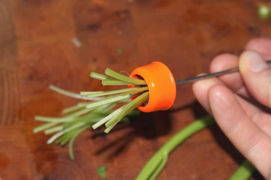 - Poussez, le liseron est découpé !! Magique !! Bien sûr, vous pouvez vous passer de liseron et d’autant plus du découpoir. C’était juste pour la beauté de l’ustensile !! Si vous mettez le liseron, coupez simplement en lamelles.