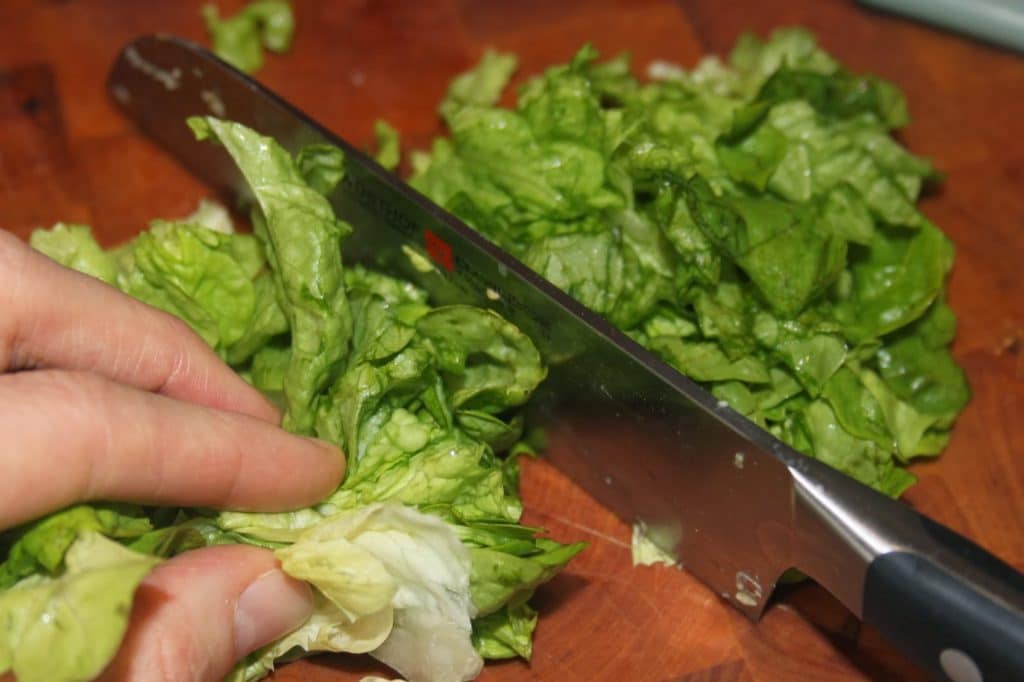 - Lavez et coupez les feuilles de laitue (ou ici des feuilles de chêne). Il en faut 3-4 par personne.