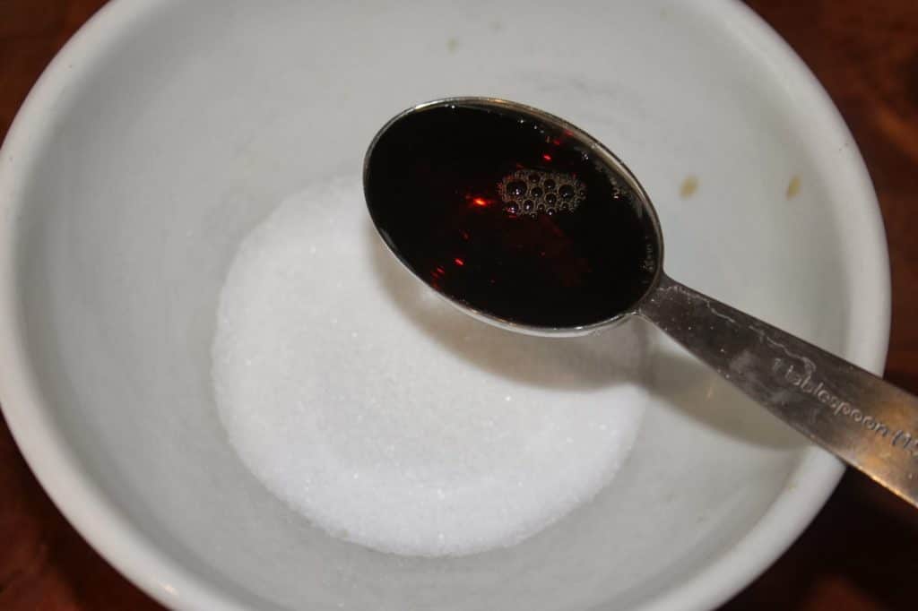 - Pour la sauce salade: mélangez le sucre et le nuoc mâm jusqu’à ce que le sucre soir dissous.