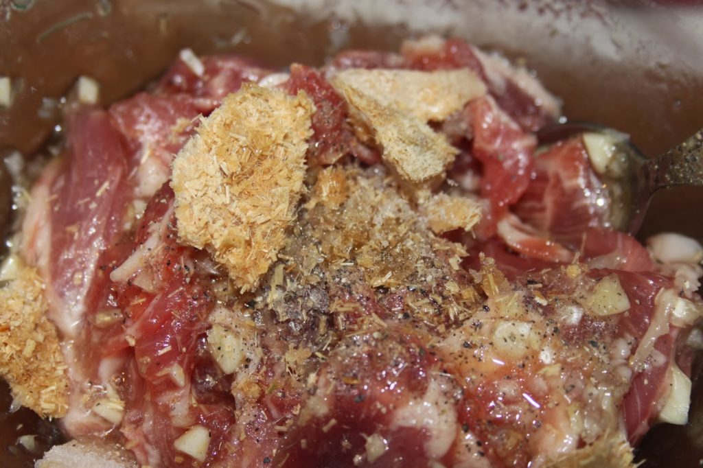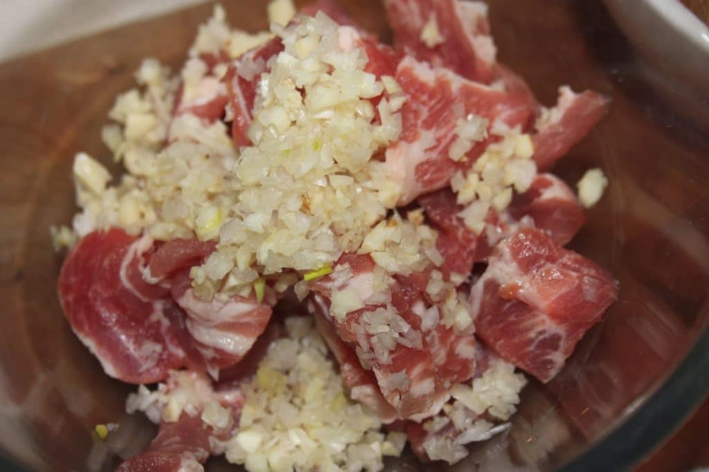 - Placez le porc dans un récipient, ajoutez l’ail et l’échalote finement hachés.