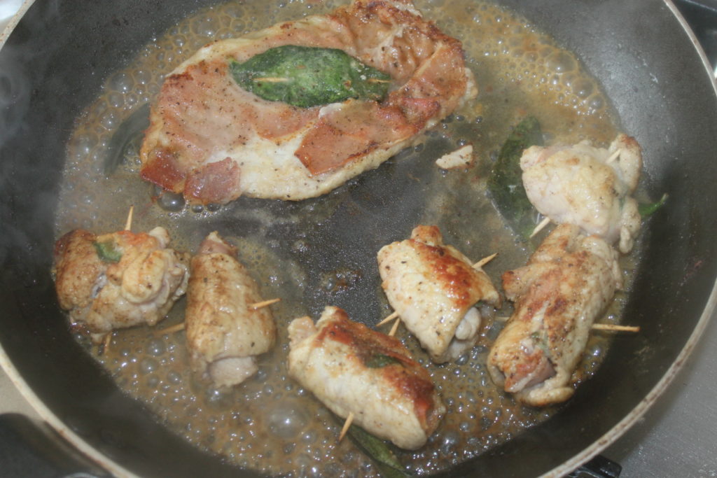 - Faites de même avec le reste des satimboccas. On est limité par la contenance de la poêle, donc il faudra faire cuire au fur et à mesure. Je nettoie la poêle juste avec un papier absorbant entre chaque cuisson. Pour les chutes de viande, comme cela sera plus petit ou avec des morceaux, on pet aussi enrouler le tout.