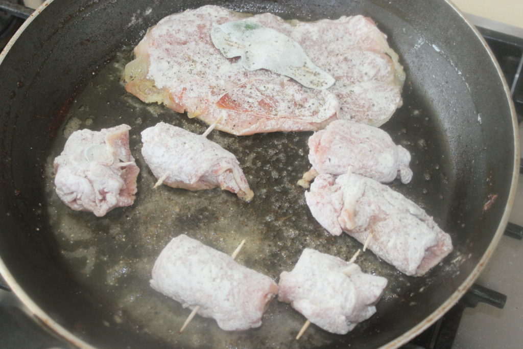 Do the same with the rest of the satimbocca. We are limited by the capacity of the pan, so we will have to cook as we go. I clean the pan just with a paper towel between each cooking. For the scraps of meat, as it will be smaller or with pieces, we can also roll up the whole thing.