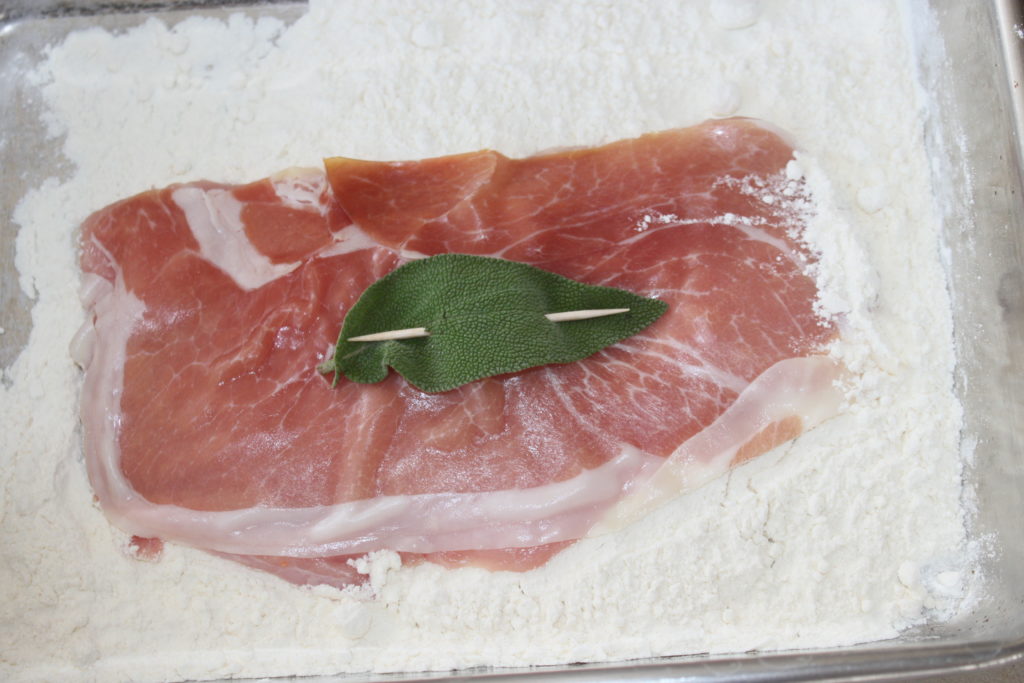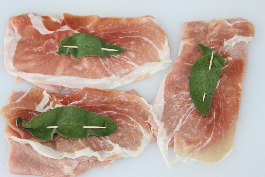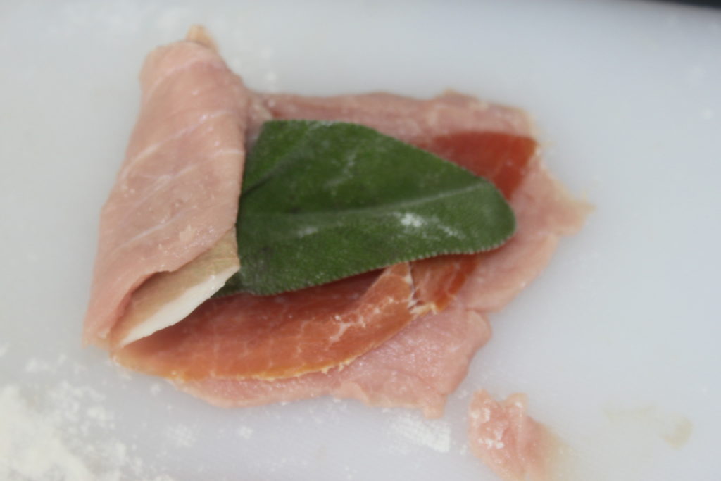- Coupez le veau autour du jambon pour que le tout soit de la même taille. Ne vous inquiétez pas des chutes, on s’en occupe juste après ! Placez une belle feuille de sauge sur le jambon, puis avec un pic en bois, attachez le tout comme sur la photo.