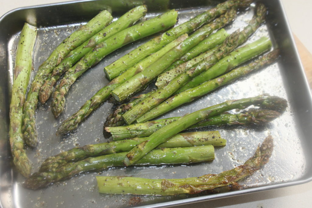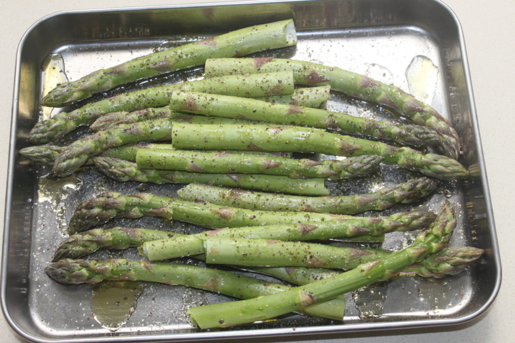 - Pour accompagner cette recette, j’ai fait des asperges vertes grillées au four. Pour cela, je coupe la base, je les lave et les égoutte puis les place dans un petit plat allant au four. J’arrose d’huile d’olive, je sale et je poivre puis je fais cuire 20-25 minutes dans un four préchauffé à 205°C. Mettez-les à cuire avant de passer à la suite de la recette.