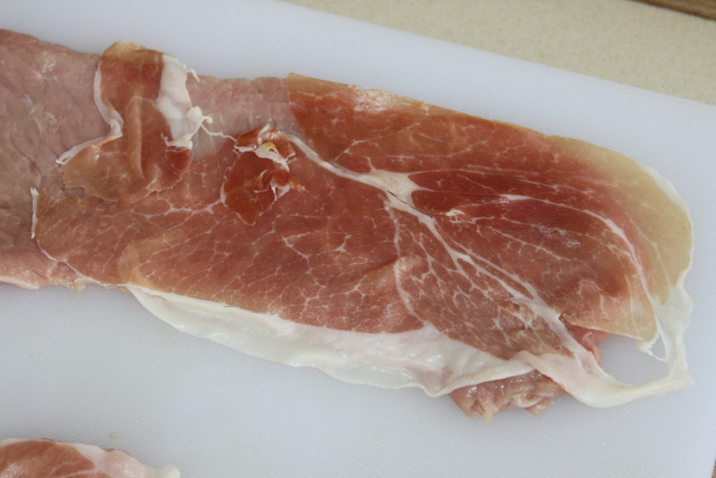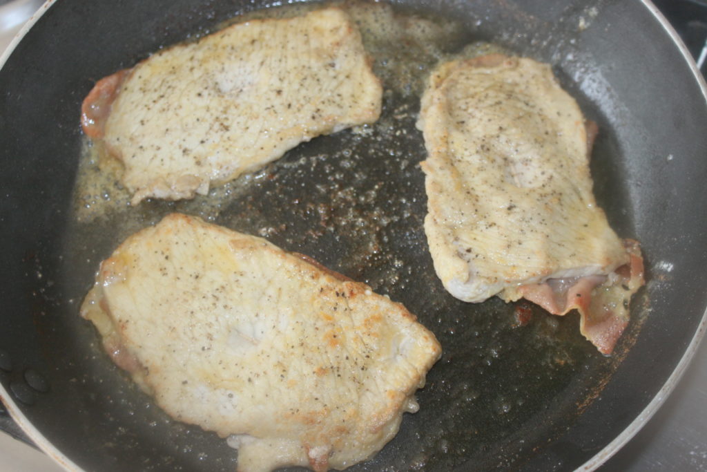 When the butter crackles, add the meat first on the veal side. Pepper to your taste, but salt lightly, because raw ham is quite salty.