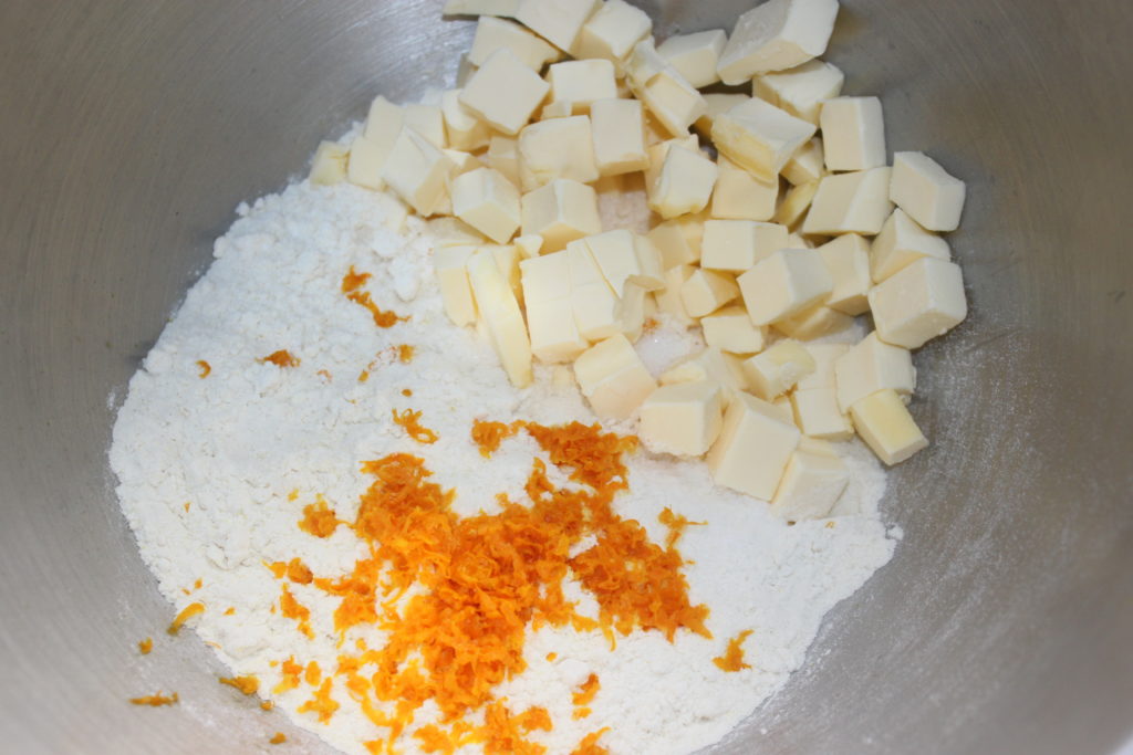 - Mettez tout d’abord le beurre coupé en cubes de 8mm environ au congélateur pendant une bonne heure. Mettez la farine, la levure, le sucre, le sel et le zeste d’orange avec le beurre congelé coupé en cubes dans la cuve du robot muni de la feuille.