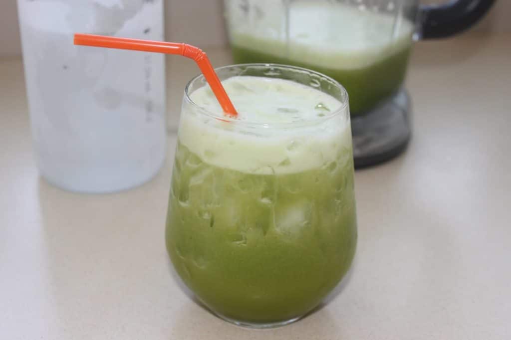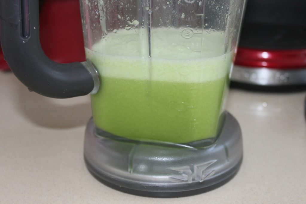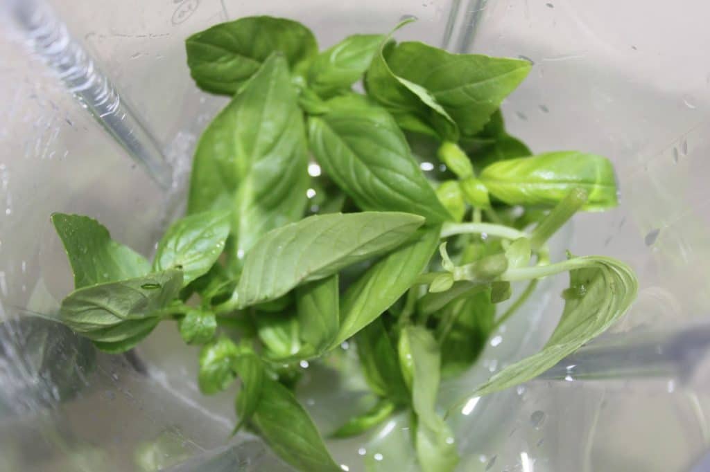 Et mixez pour avoir un liquide vert sans aucune trace de feuille de basilic.