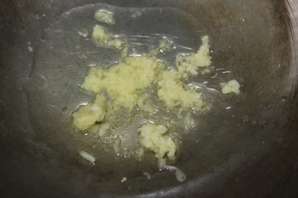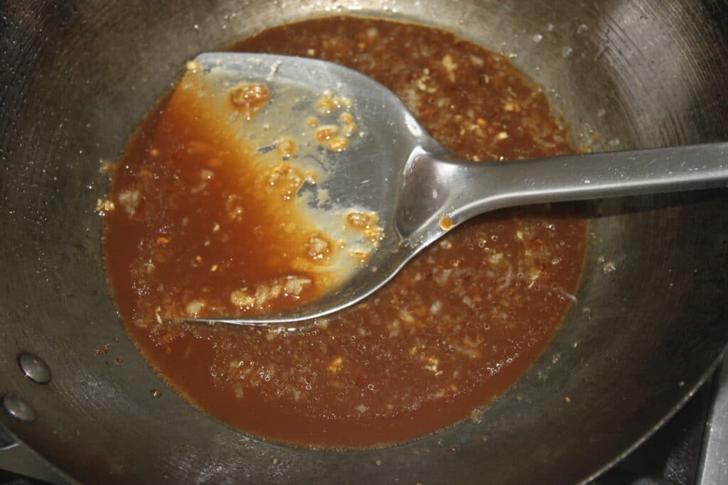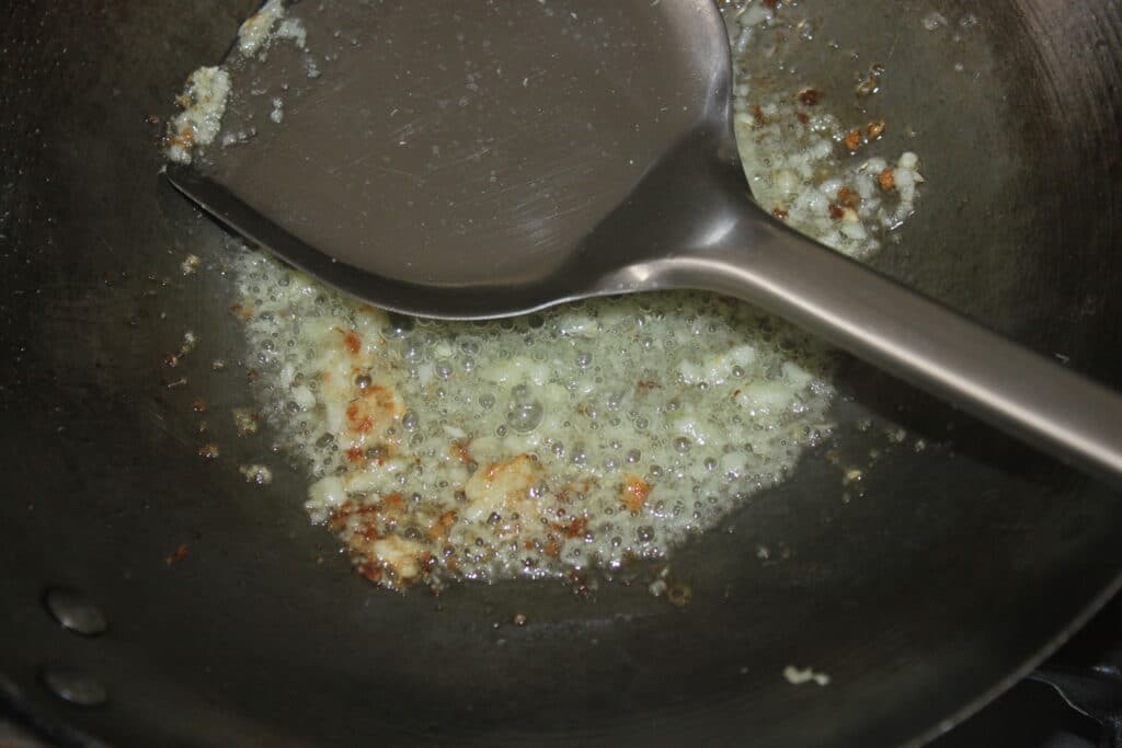 Pour la sauce : versez l’huile, l’ail et le gingembre dans le wok (ou une casserole). Faites chauffer pour colorer le tout.