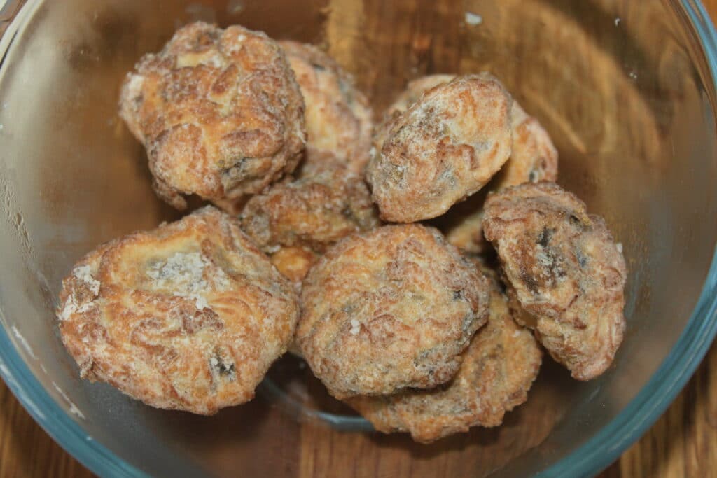 - Faites de même pour tous les champignons. Faites chauffer un récipient d’huile à 180°C. Secouez un peu les champignons pour enlever l’excédent de fécule, puis plongez-les dans l’huile chaude.