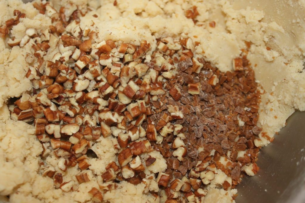 - Versez les éclats de caramel et les morceaux de noix de pécan.