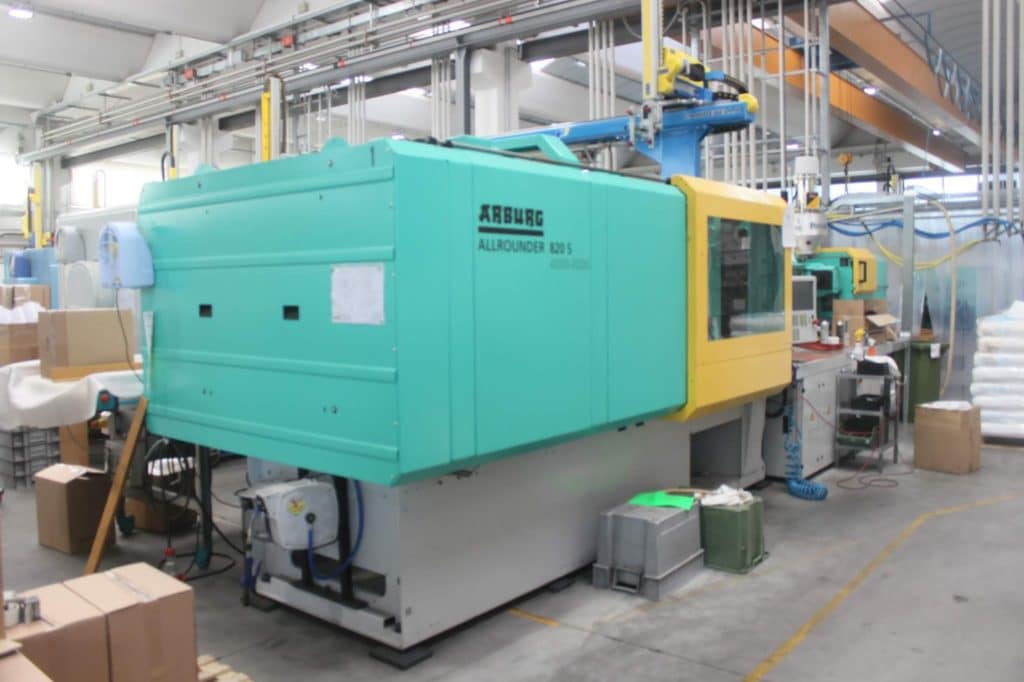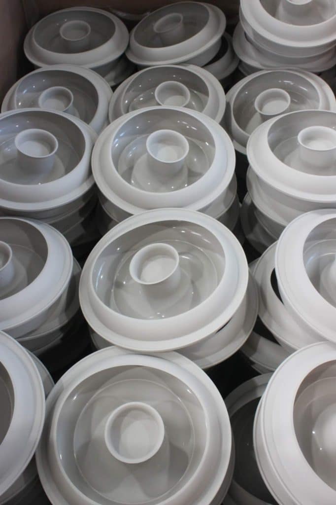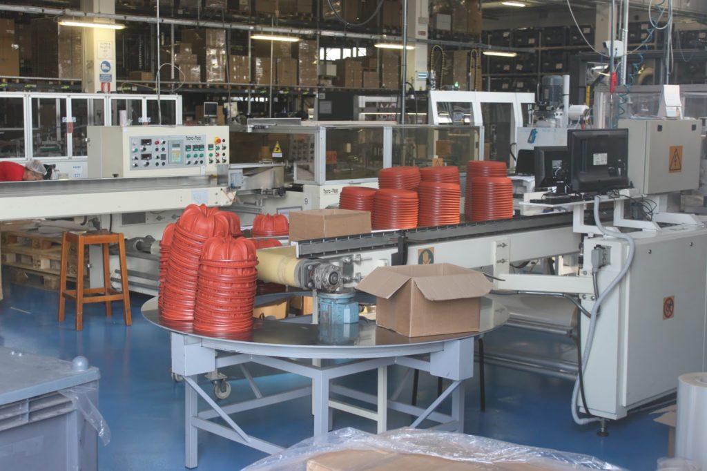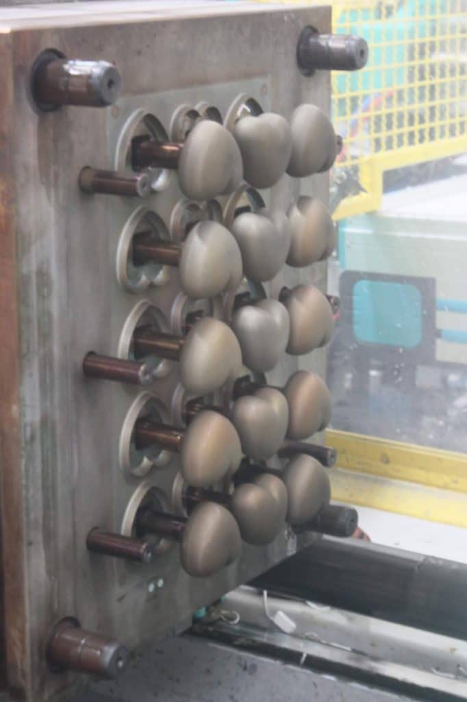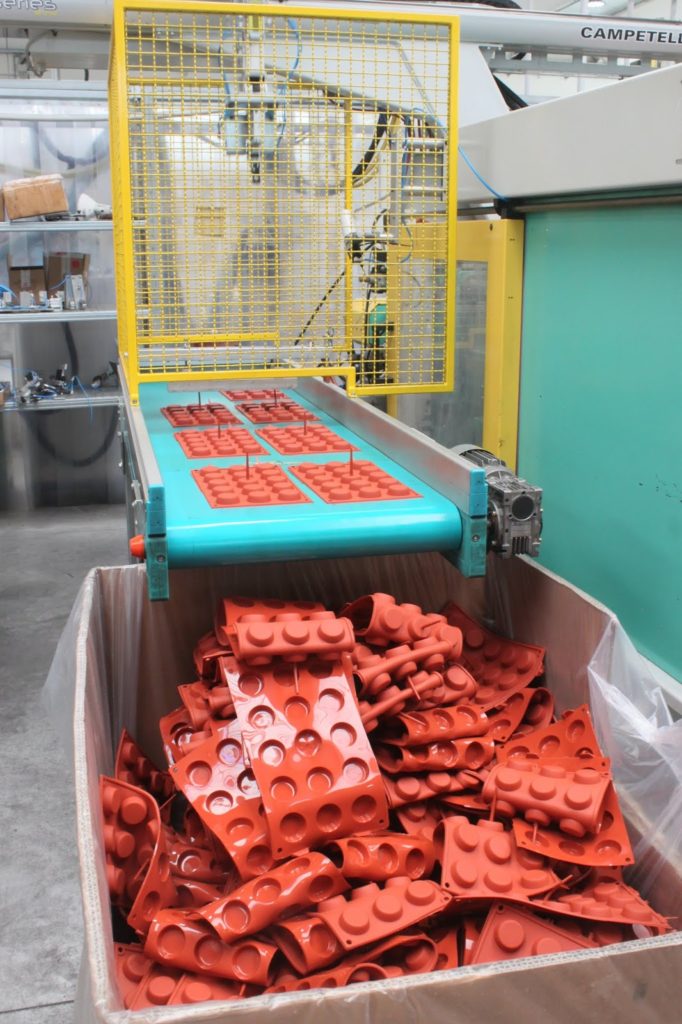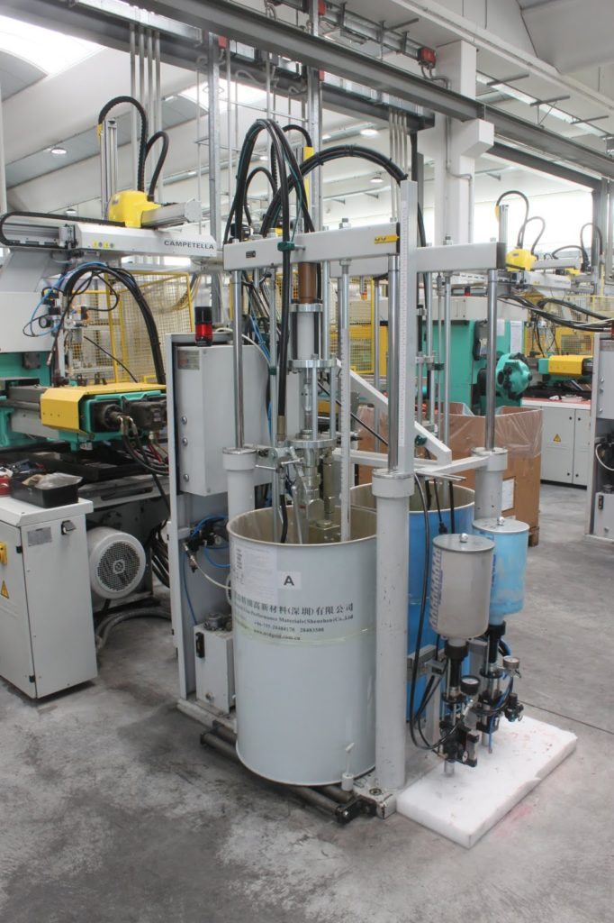 On voit ici les deux cuves un pour le silicone et une pour le catalyseur. Une machine récupère les matériaux et le mélange. Le silicone est injecté ensuite sous pression dans les matrices en métal où il cuit en quelques secondes. Un pince vient récupérer le moule formé. Ça c’est pour les motifs plus simples.