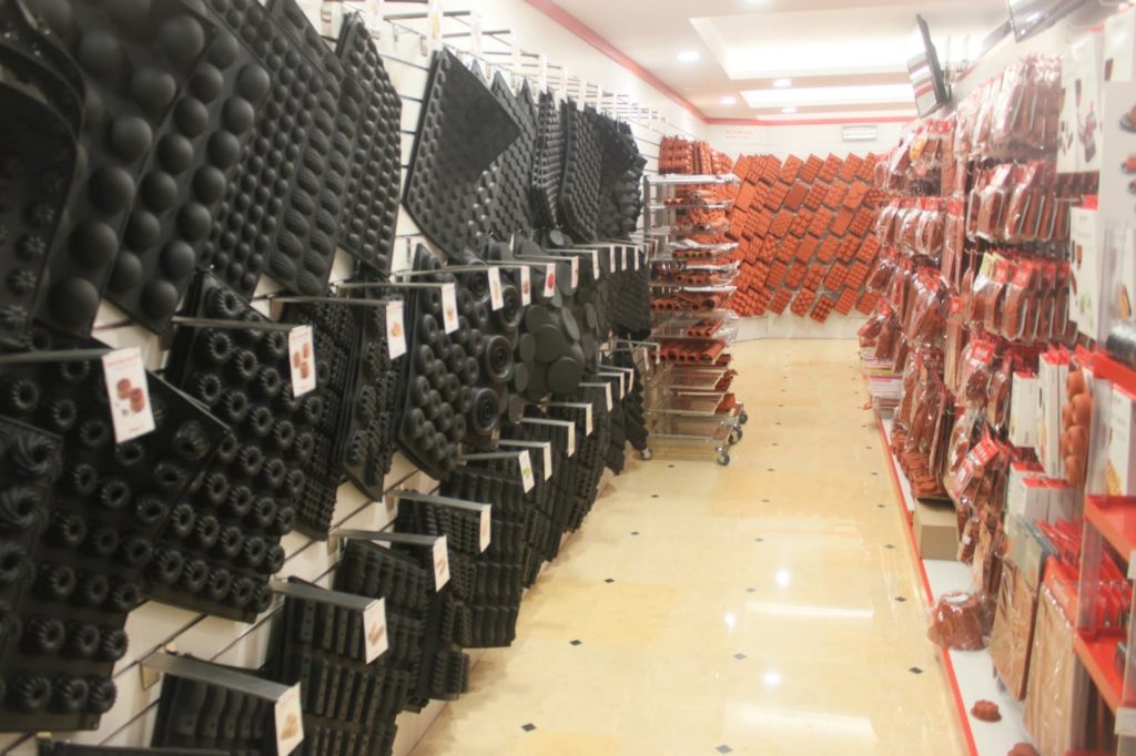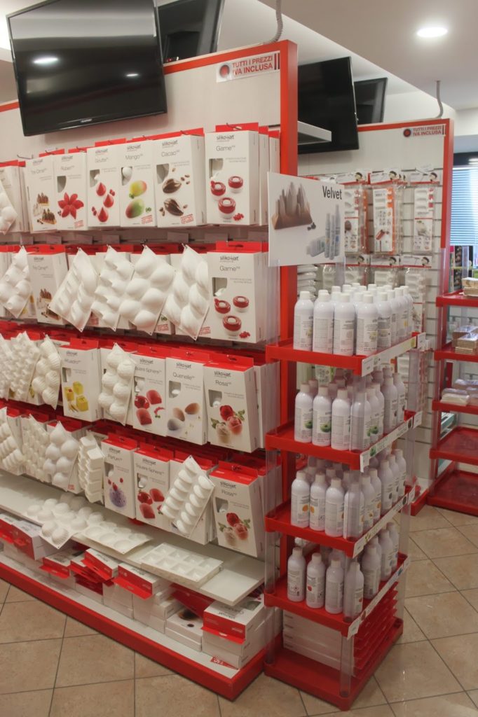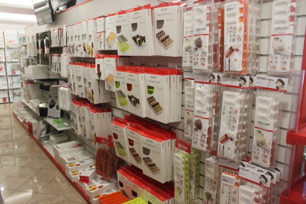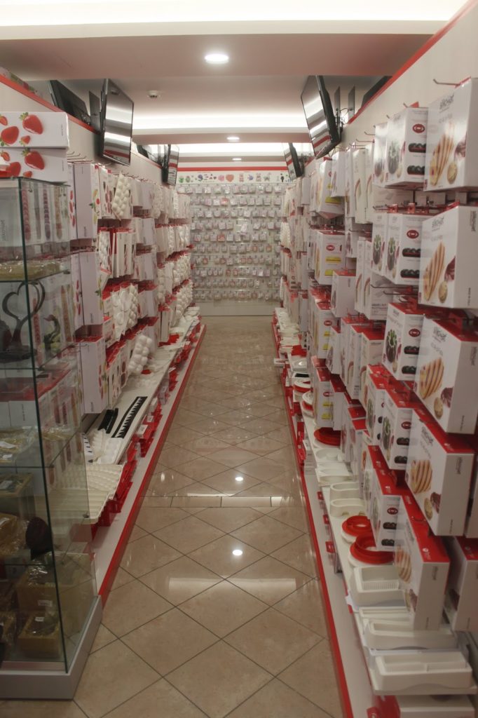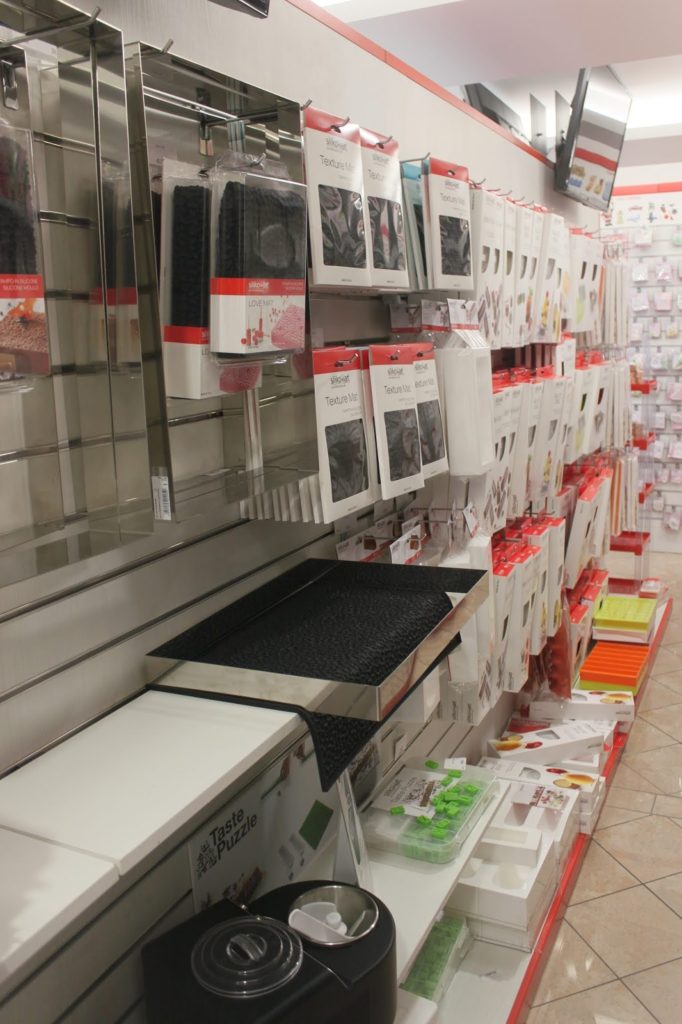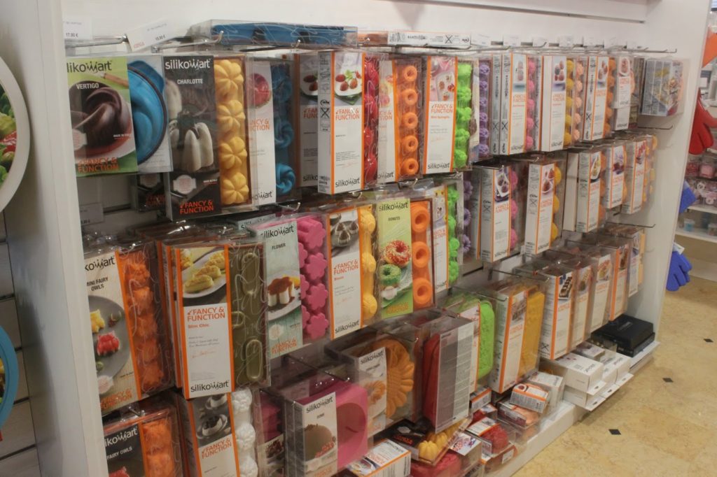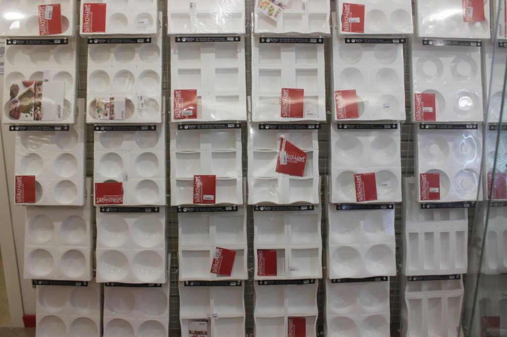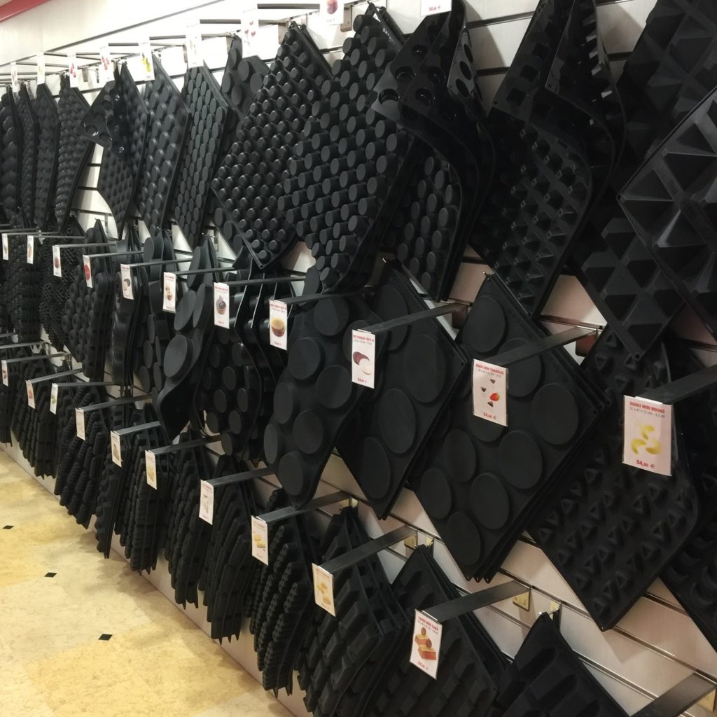 Dans la boutique, qui est très grande, il y a la partie grand public et la partie des moules pro. On voit la différence grâce à la couleur du silicone. Le blanc est en général pour les chefs. Mais quelque soit la couleur, la qualité du silicone est la même !