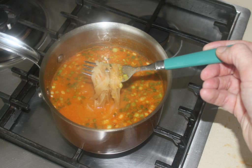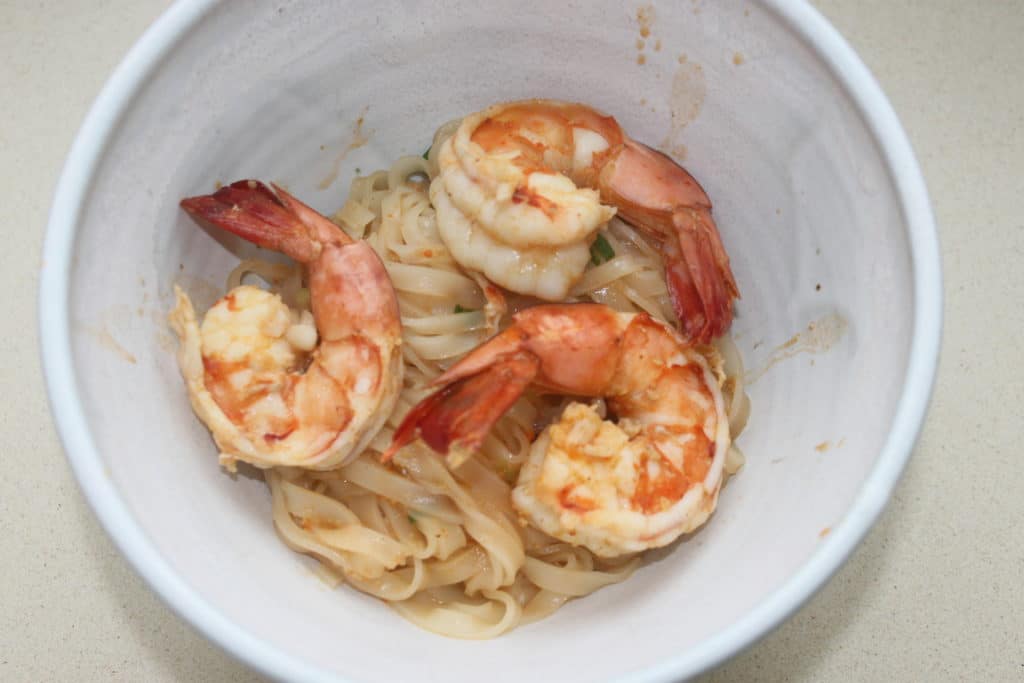 Retirar las gambas cuando estén cocidas. Añade los fideos en su lugar. Tienen que cocinarse durante un minuto, ¡así que está casi hecho!