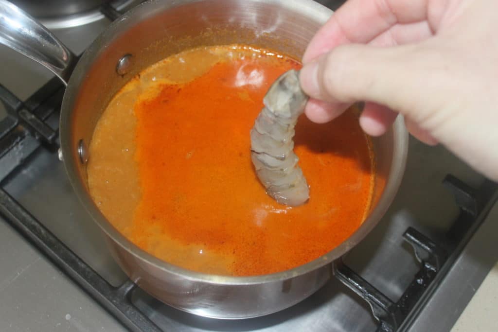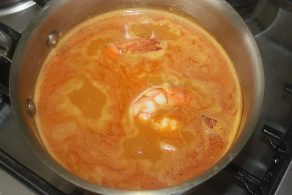 Cuando esté listo para comer: cocine los camarones durante 4 minutos en el caldo hirviendo.