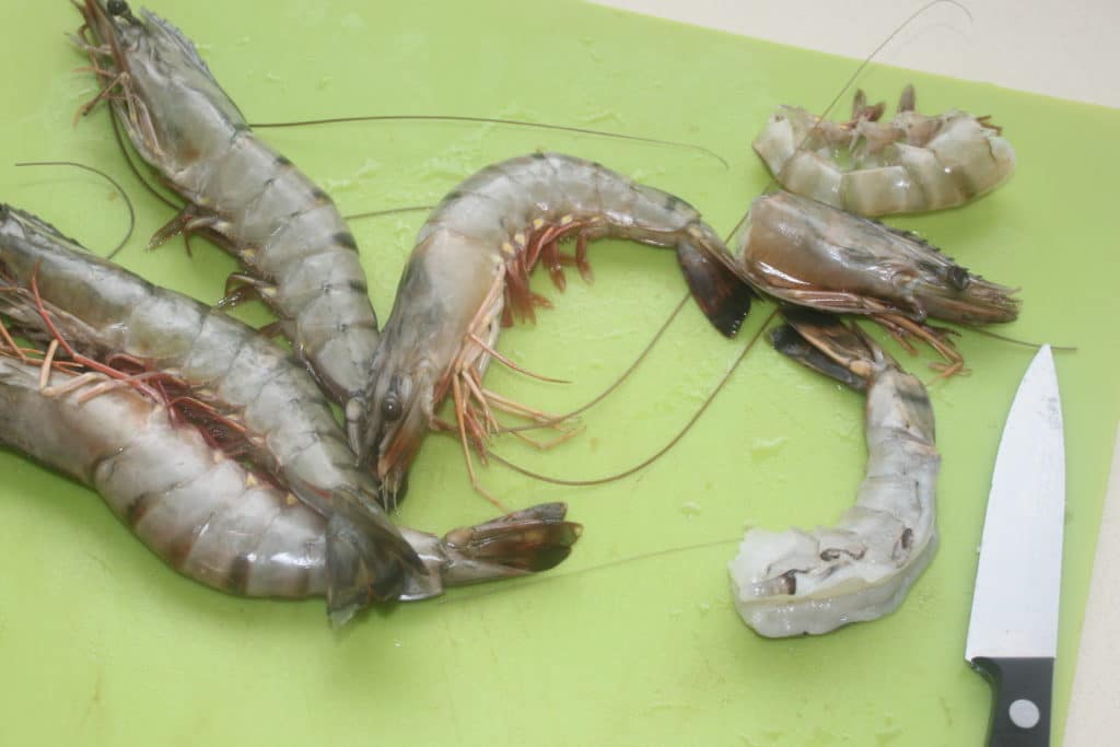 Pelar las gambas. Quito la cabeza y parte del caparazón, dejando la punta de la cola. Cortar las gambas por el lomo para eliminar la parte negra.