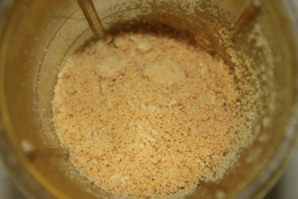 Moler los cacahuetes tostados sin sal hasta convertirlos en un polvo relativamente fino.