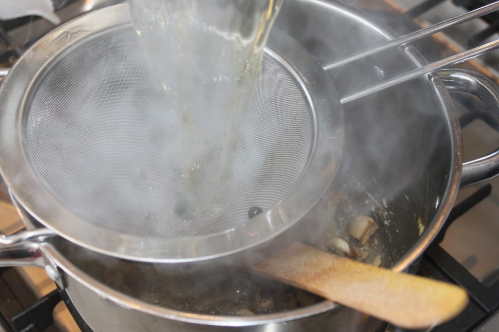 - Mélangez de nouveau pour bien la répartir puis versez le bouillon en le filtrant (surtout pour les grains de poivres et les baies).