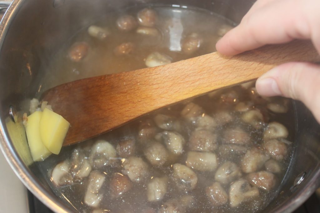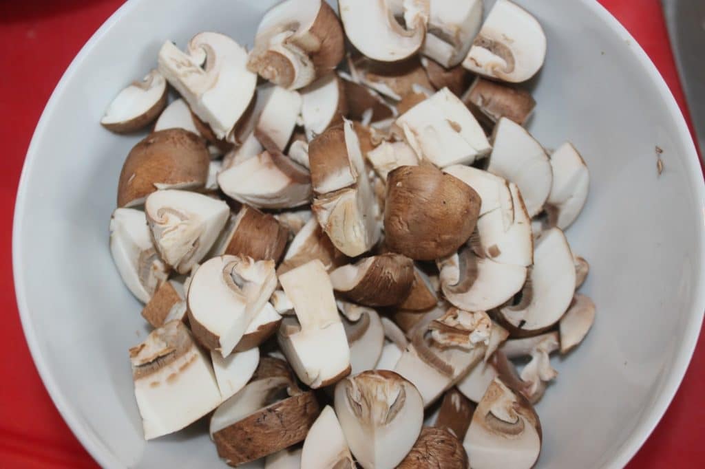 - Coupez les champignons et les pommes de terre en morceaux.